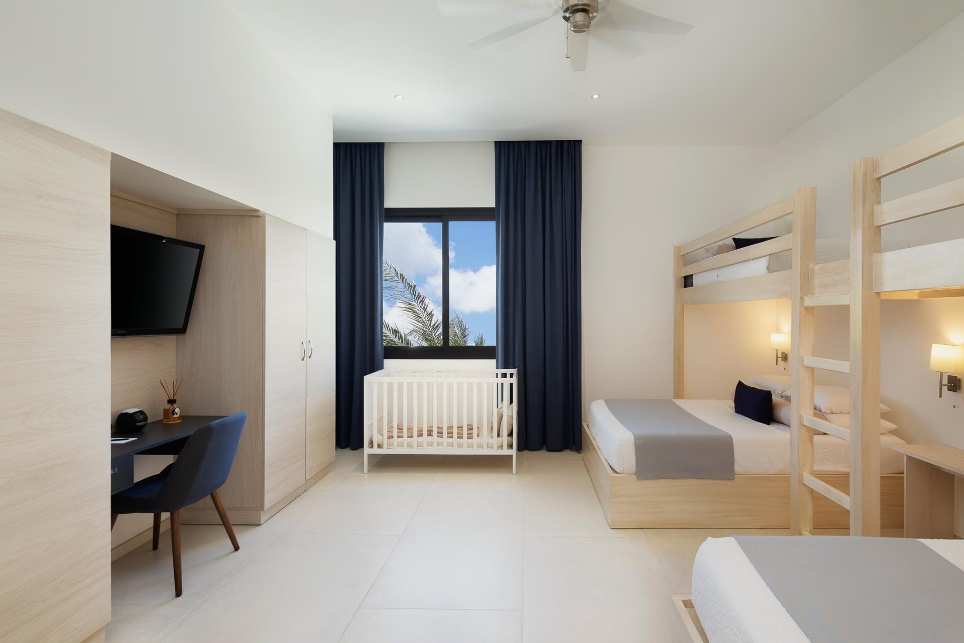 Bedroom 9 (Family) – 2 x queen-size beds + 2 x single bunk beds, en-suite bathroom with shower, and terrace access