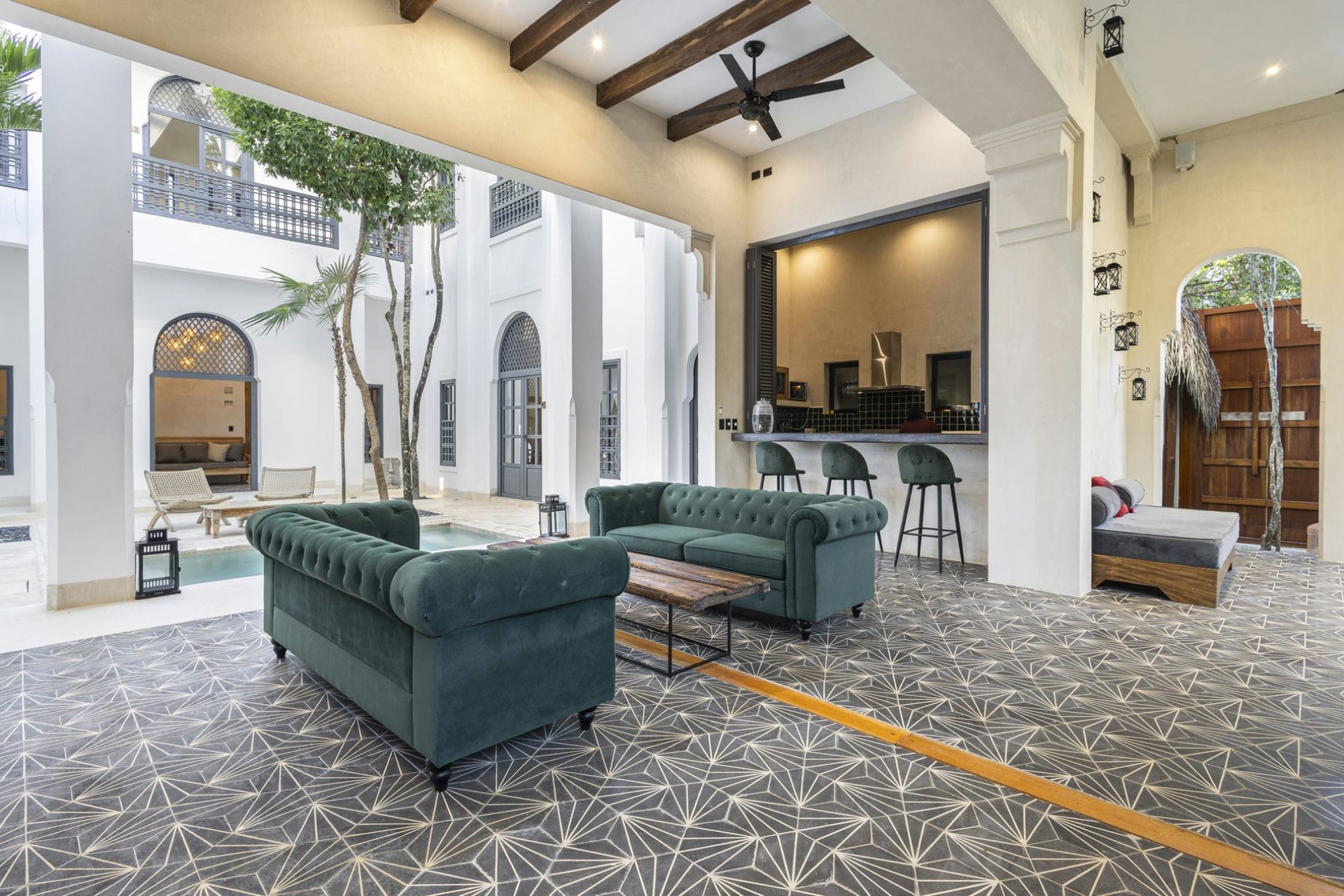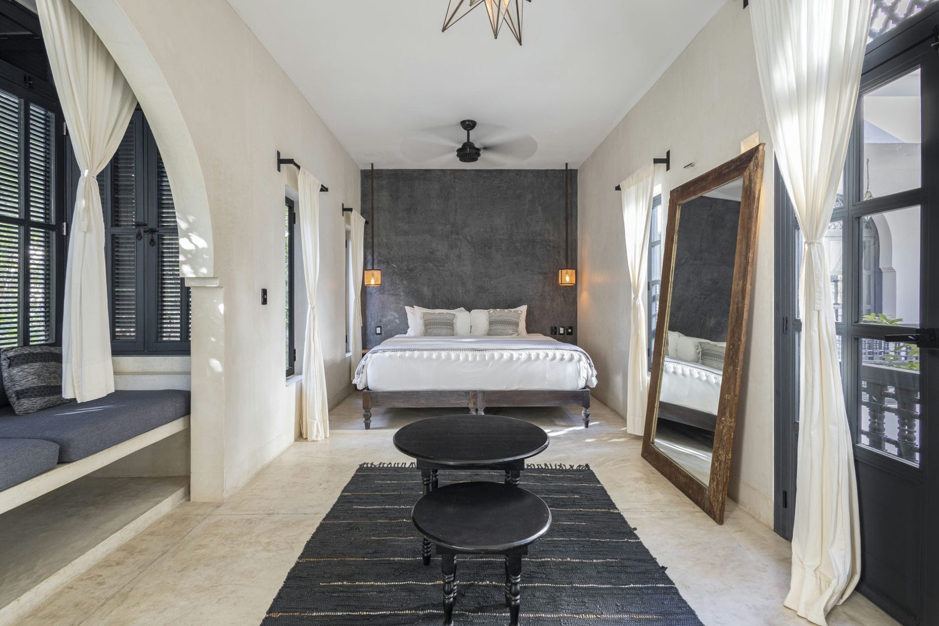 Seamlessly blending indoor and outdoor living, the gardens and courtyard adjoin the covered but open-air living spaces. These include a lounge with plush seating, an adjoining kitchen/bar, and an al fresco dining space. The villa also features a spacious multifunctional area beside the gardens. This versatile space can be transformed for anything from invigorating yoga sessions to family film nights, offering endless possibilities for entertainment.
