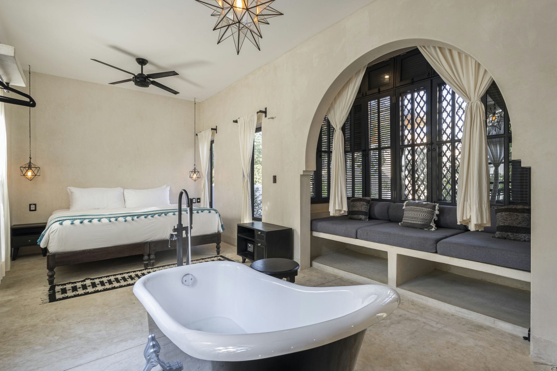 Papaya Suite (Family) – king-size bed, living area, mezzanine with twin beds (converted to king-size on request), en-suite bathroom with sunken bathtub & shower, and private garden