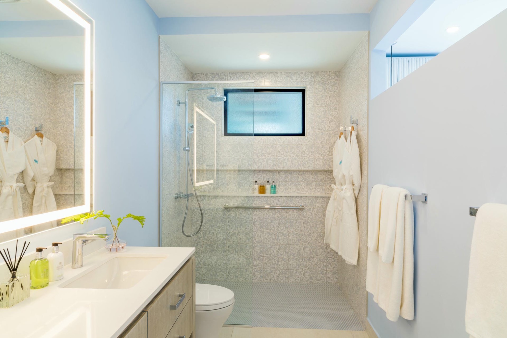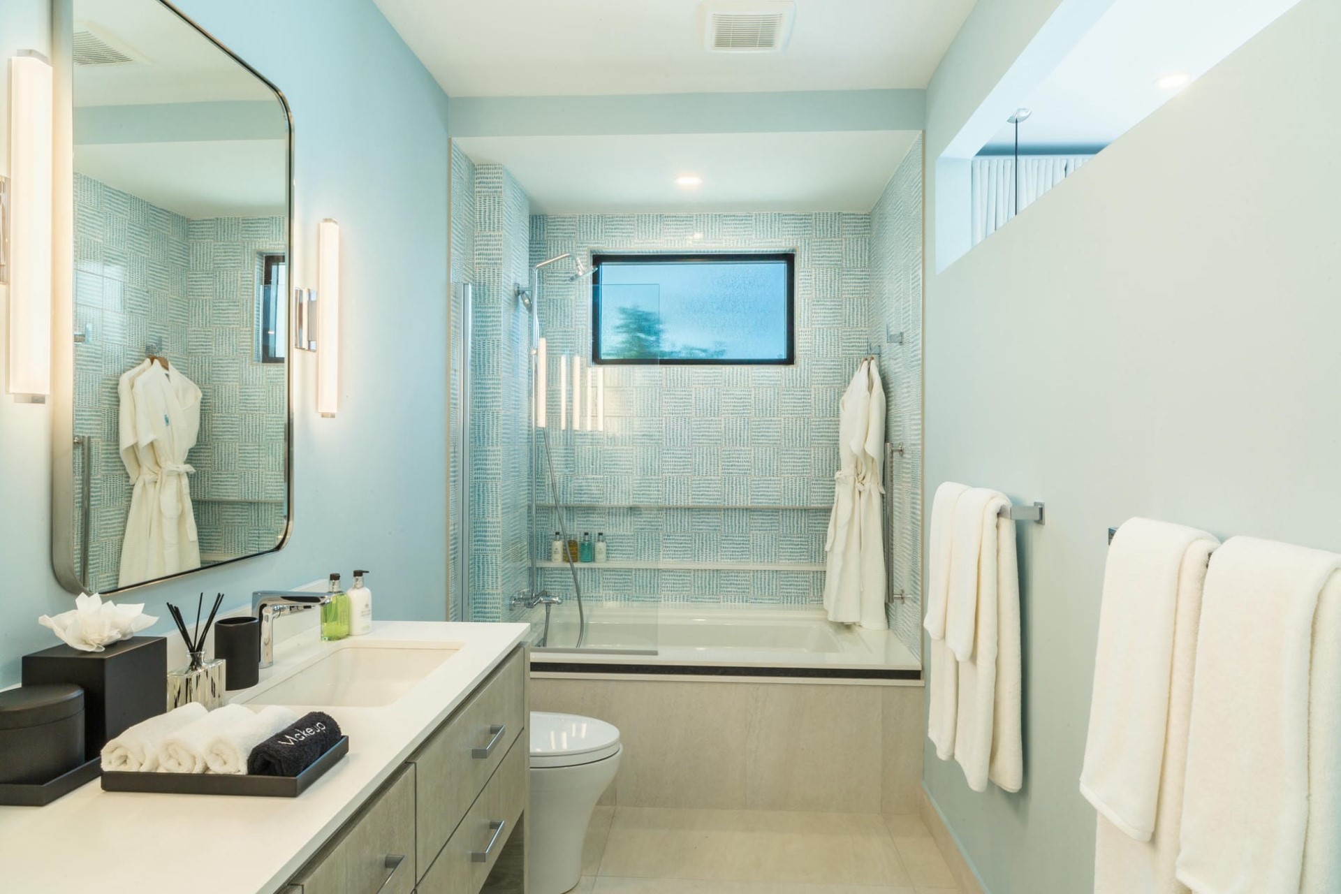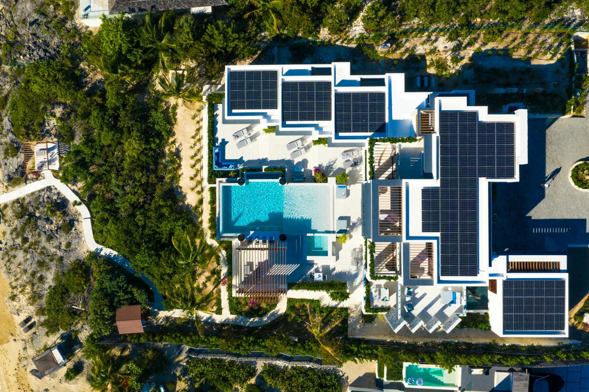 The villa’s bedrooms, each thoughtfully designed to provide a restful retreat, feature en-suite bathrooms and pockets of secluded outdoor space for a truly serene experience. The master suite, with its large private balcony overlooking the water, offers an exceptional experience with glass doors that allow guests to open up the entire room, bringing the outdoor living concept to a new level. The three additional bedrooms each have private entrances dotted along a path from the main house approaching the water’s edge, making each feel almost like its own mini-villa. They also have a dedicated sun terrace for guests to enjoy their private slice of paradise.