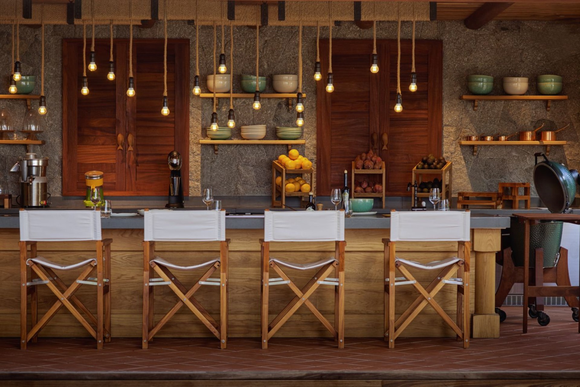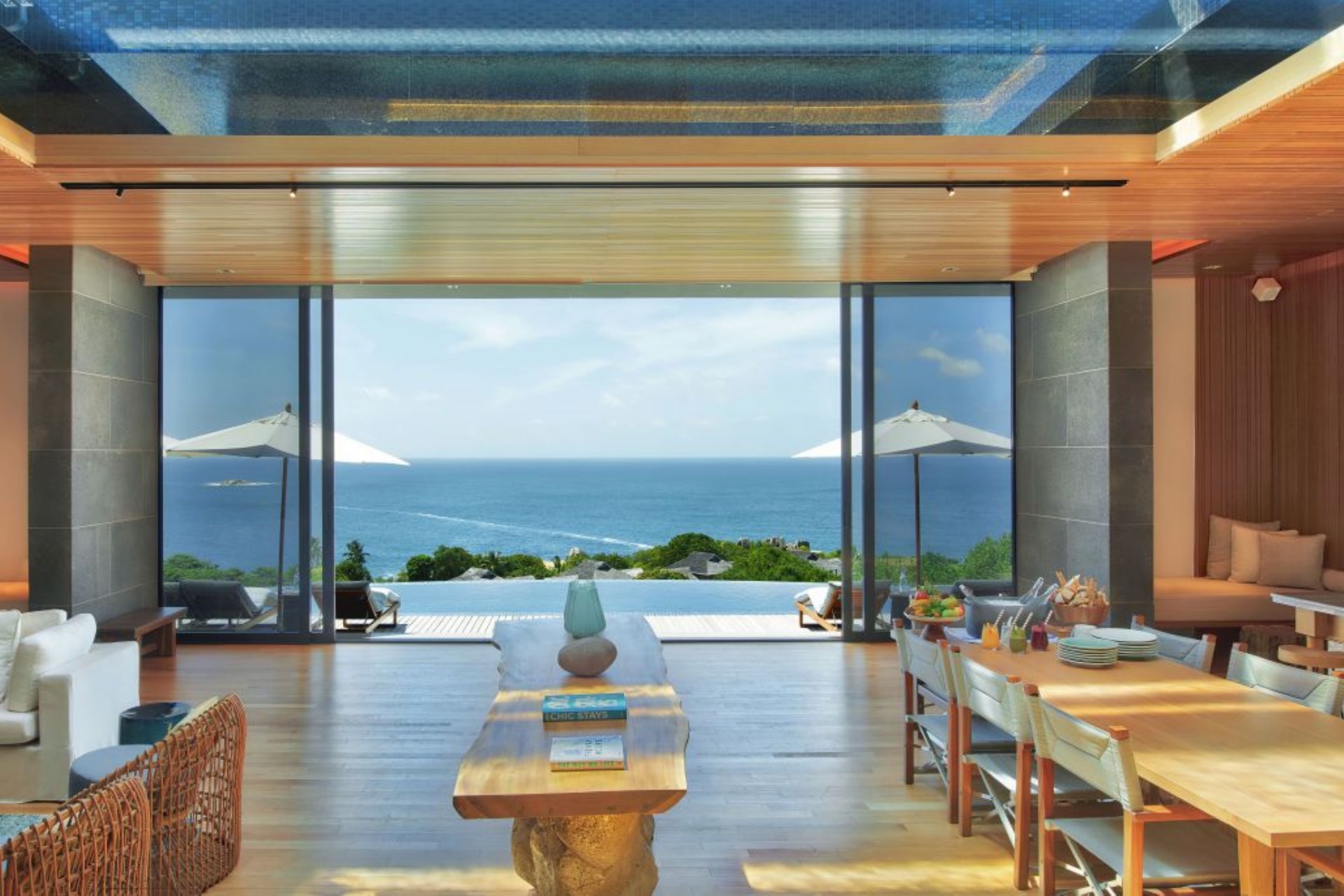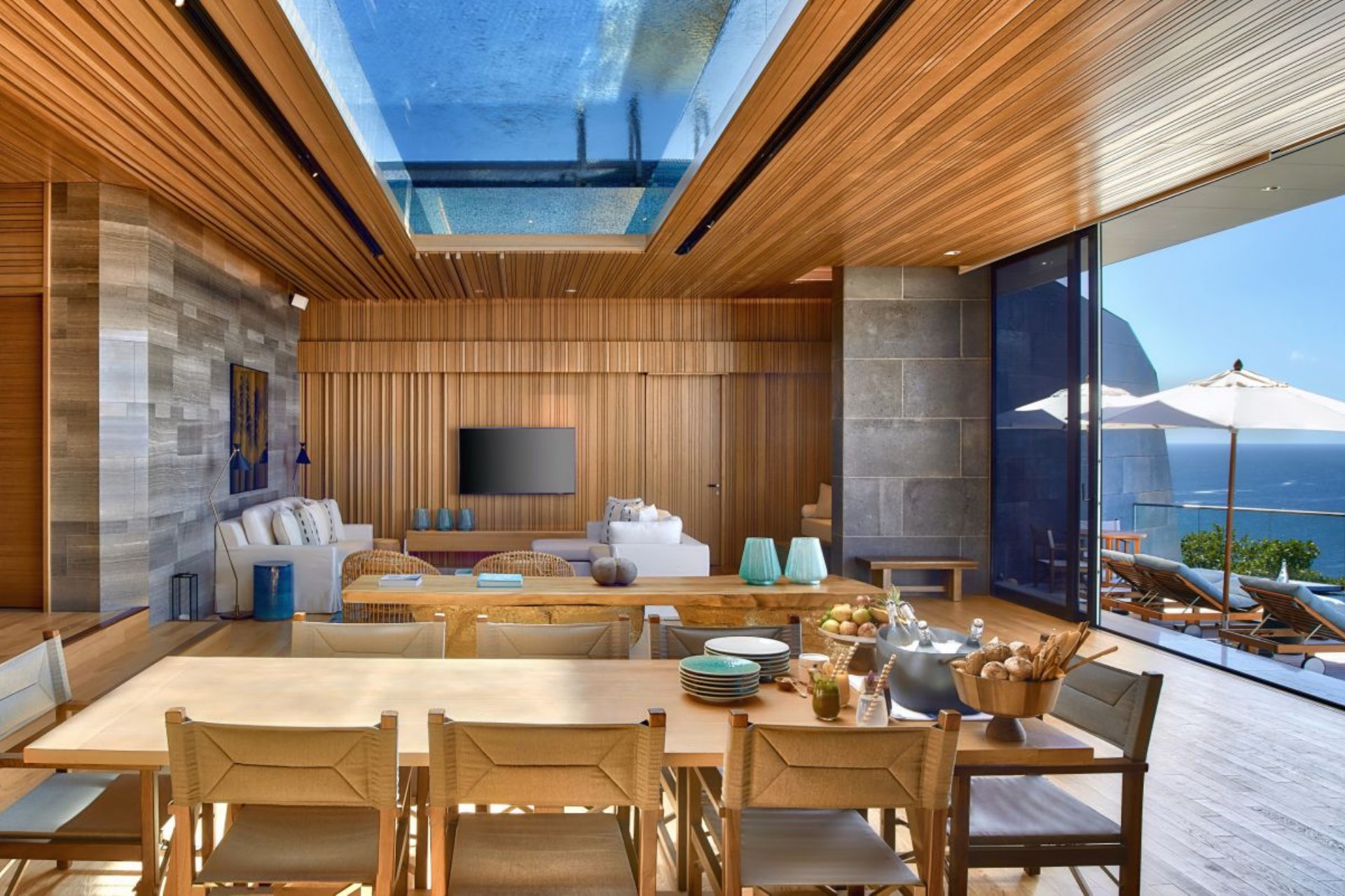 The spacious living/dining area opens out onto the main pool terrace, but also features the intriguing yet playful design element of having a pool above. Featuring a plexiglass floor, this extraordinary perspective offers an unmistakable feeling of calm and the light filters through the pool above to create exquisite patterns below, inviting a aura of relaxation and serenity and creating a mesmerising display. With vast floor-to-ceiling windows, an abundance of natural light floods the space, and highlights the stunning views outside, offering a perfect entertaining space for family dinners or social events.