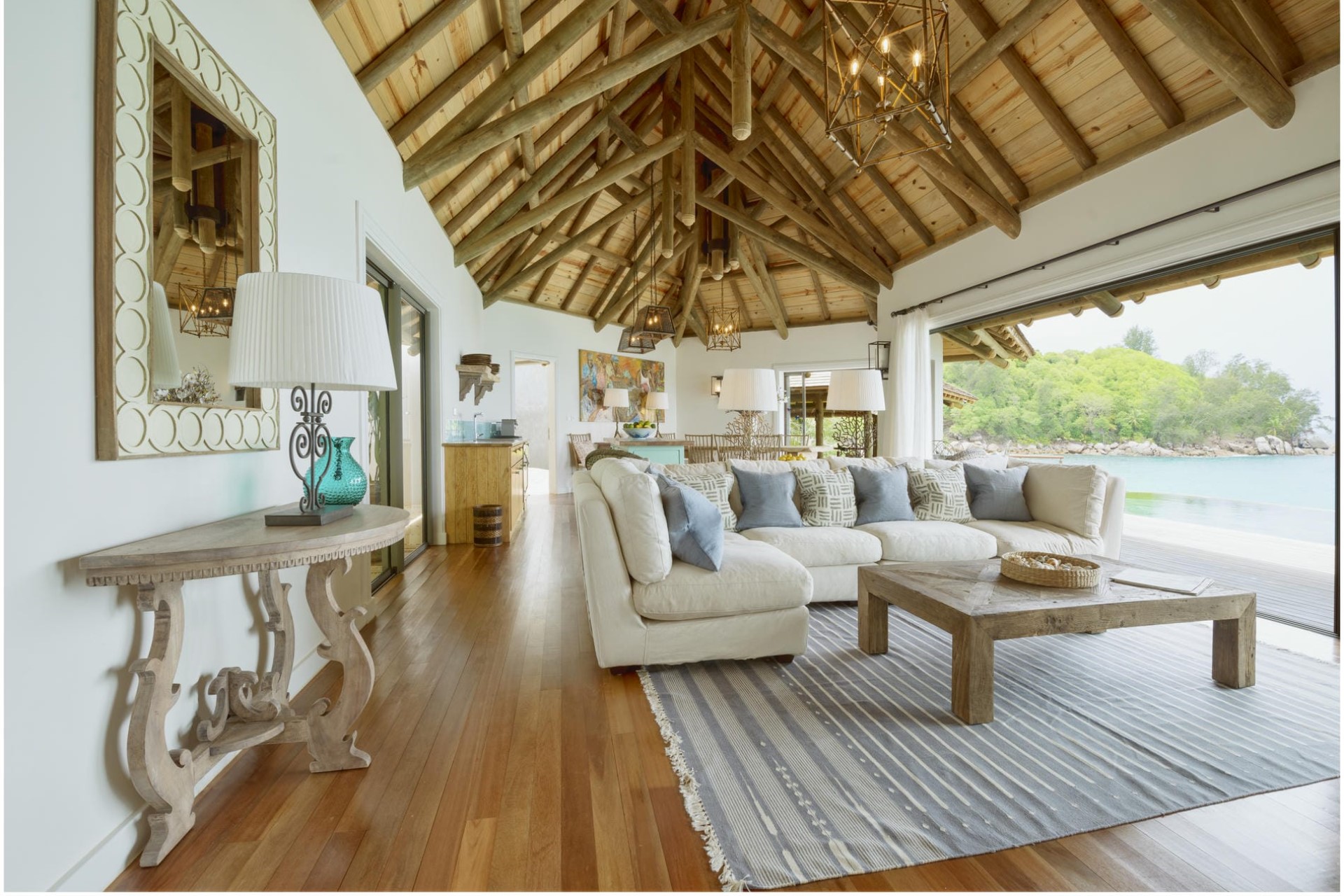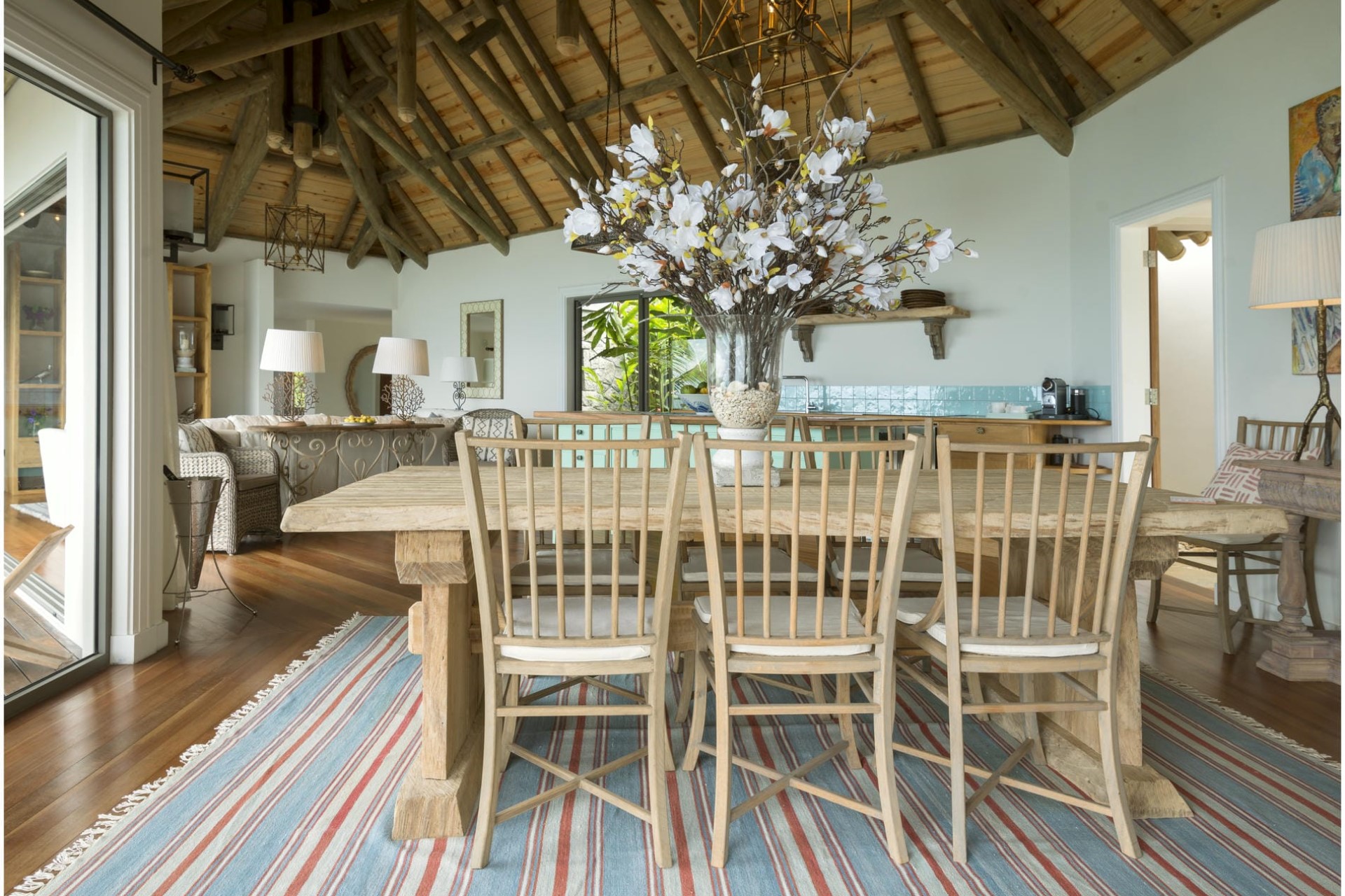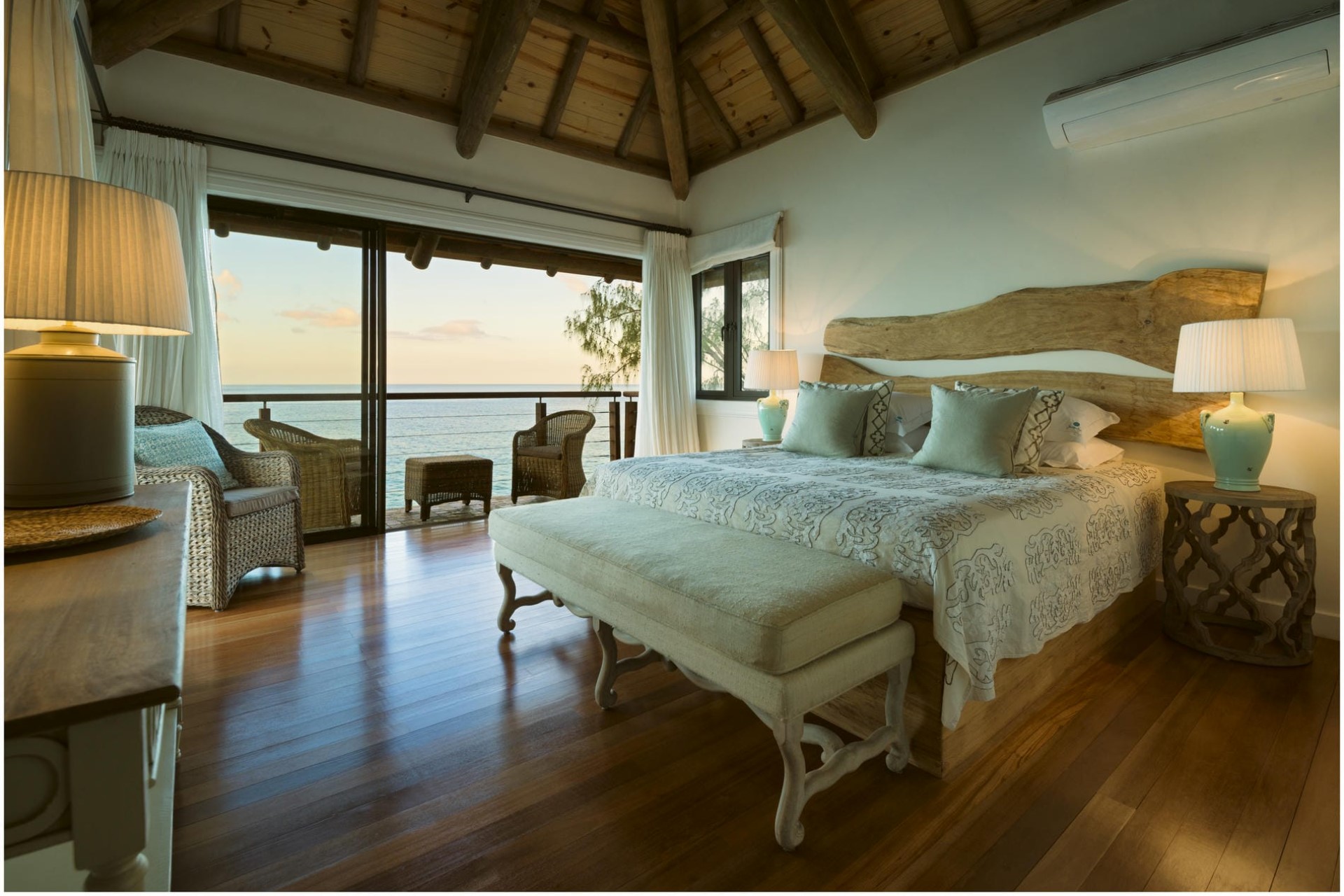 The ocean-facing villa features simple, yet inviting décor using a variety of natural materials, creating the ultimate in barefoot luxury. The open-plan living and dining area features wooden floors, high, beamed ceilings, and floor-to-ceiling windows, allowing for panormaic views and a smooth transition to the outdoors.