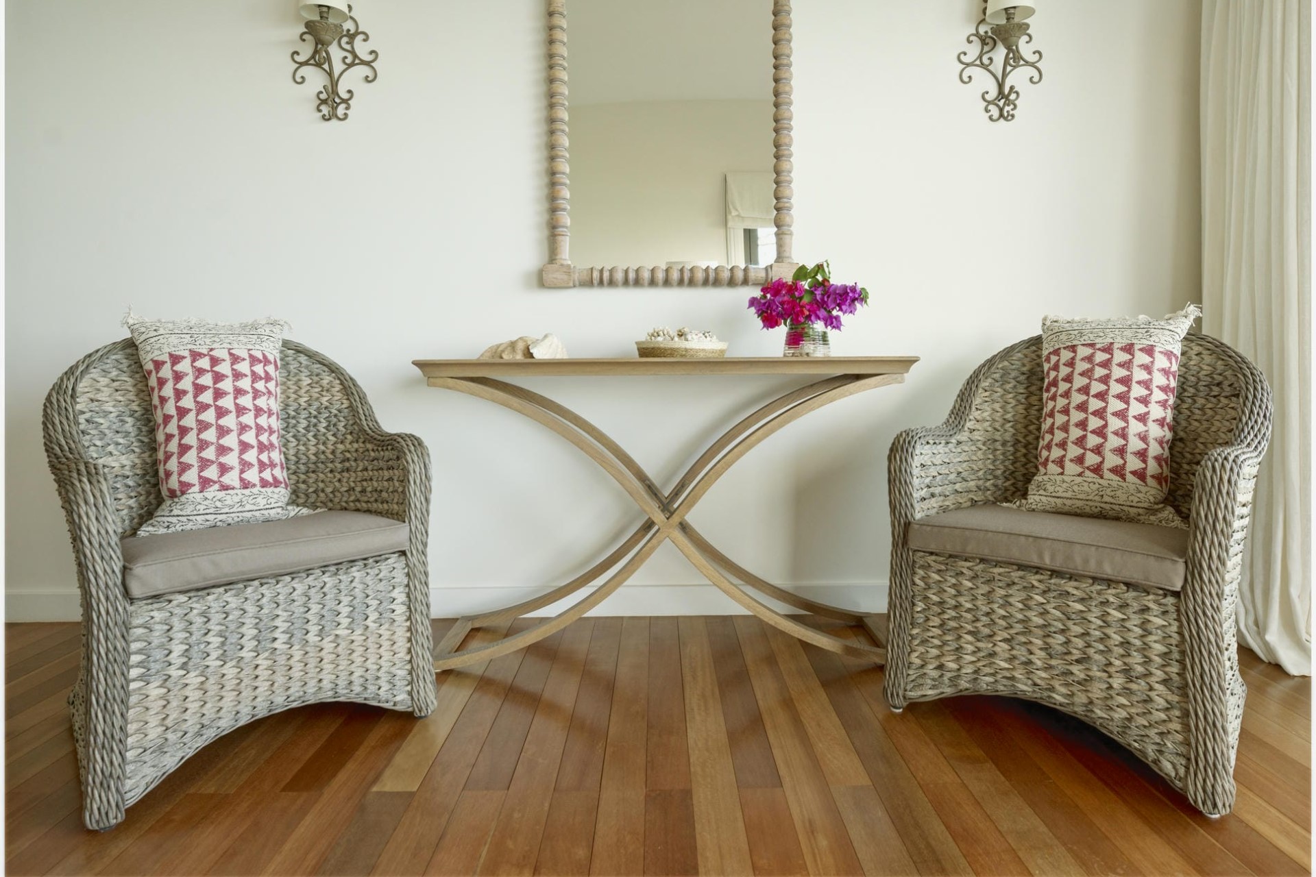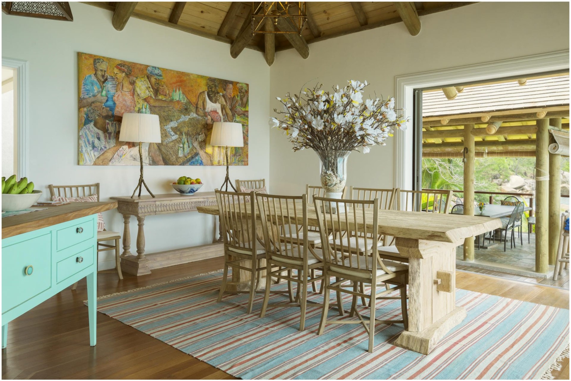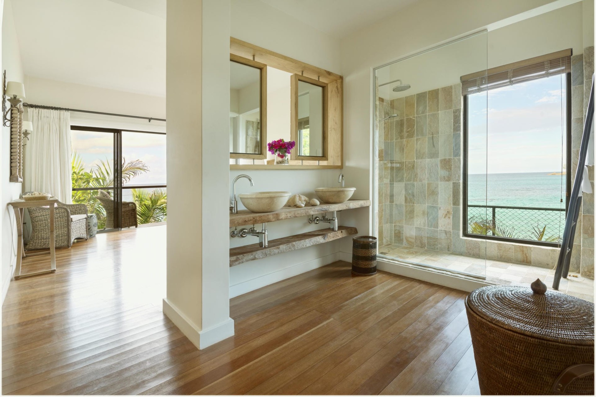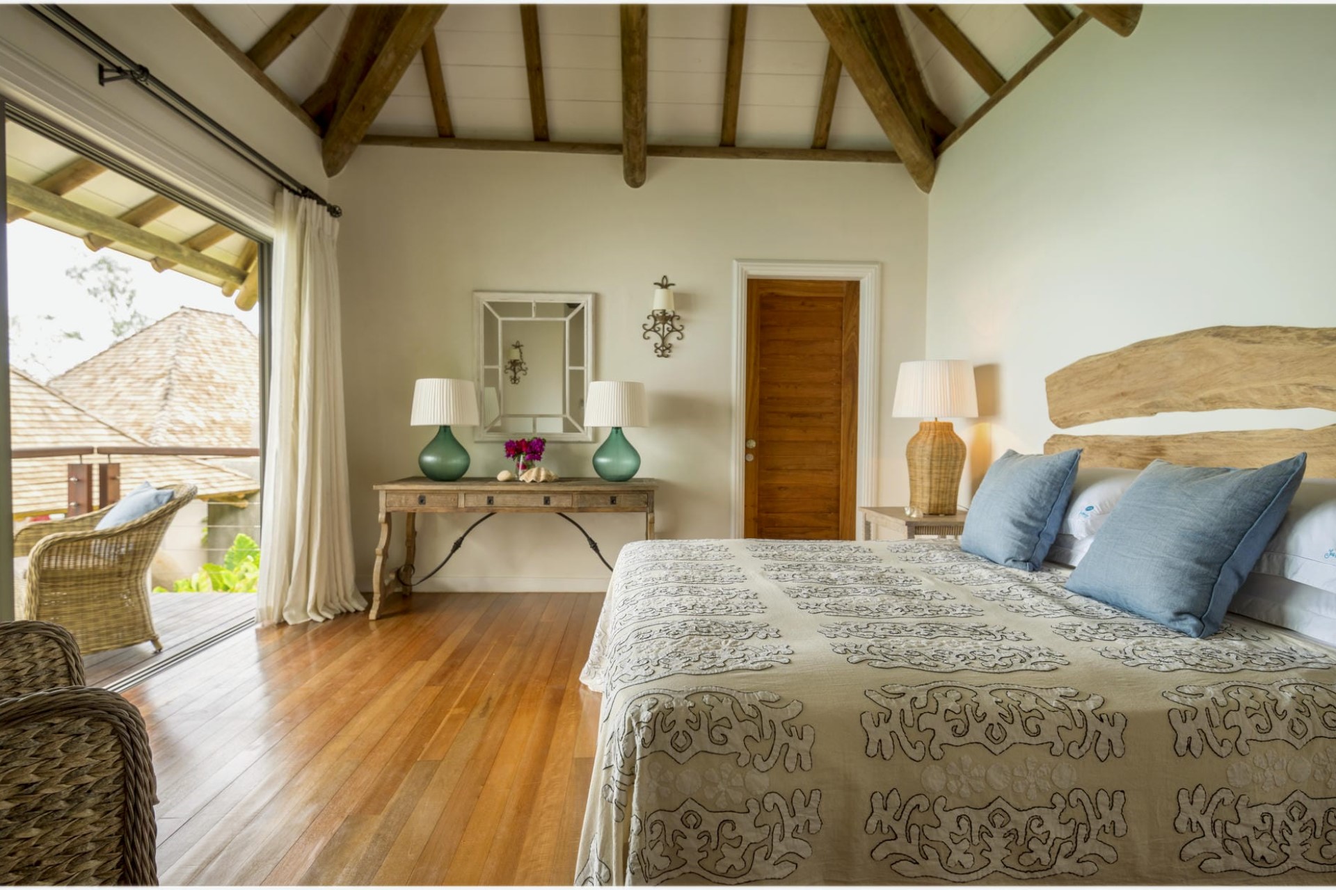 The ocean-facing villa features simple, yet inviting décor using a variety of natural materials, creating the ultimate in barefoot luxury. The open-plan living and dining area features wooden floors, high, beamed ceilings, and floor-to-ceiling windows, allowing for panormaic views and a smooth transition to the outdoors.