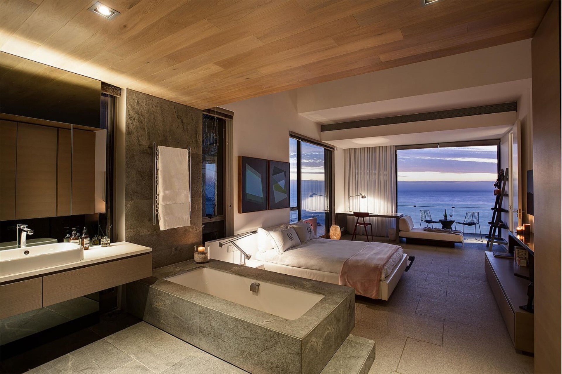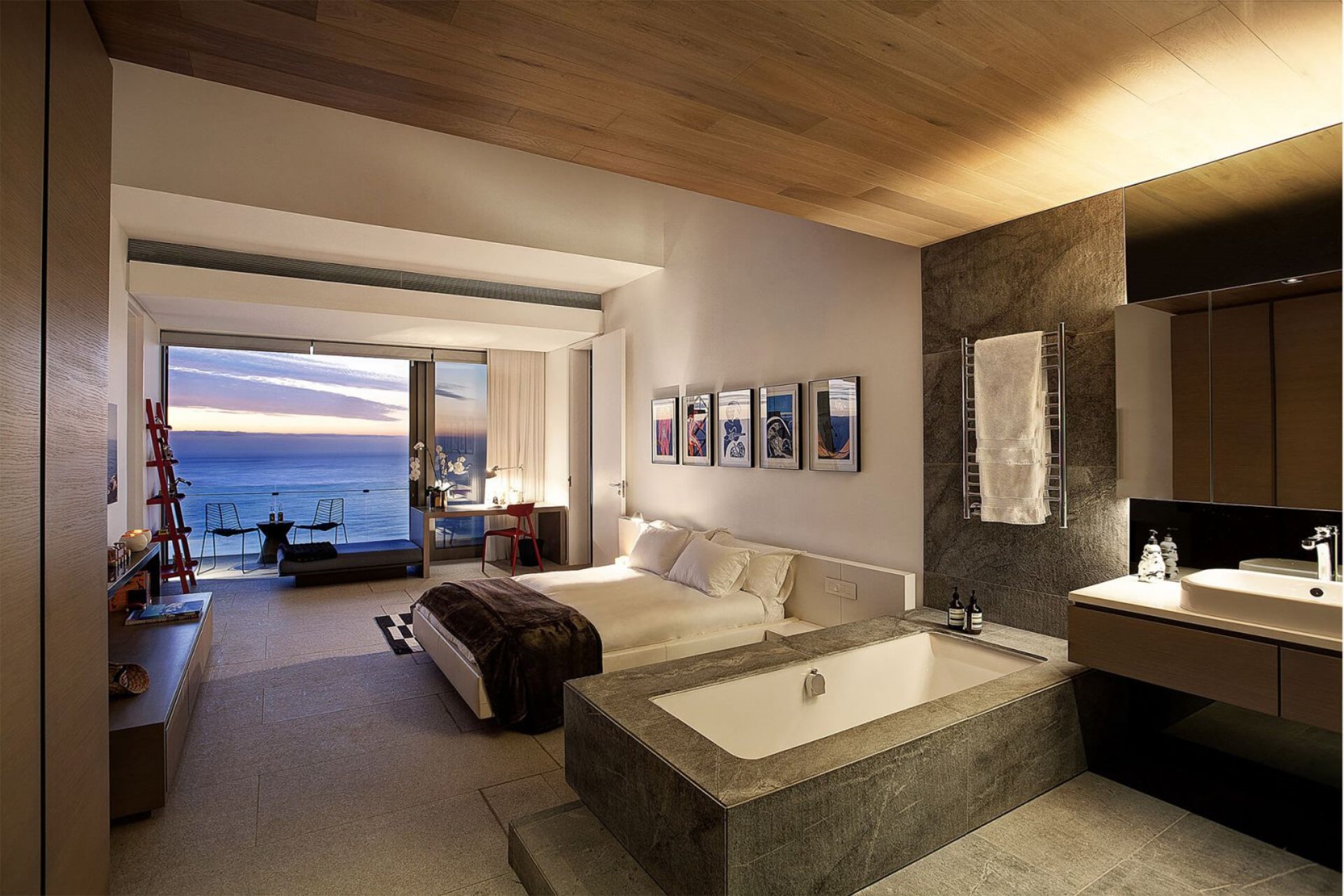 Bedroom 1 (Master) – super-king-size bed, en-suite bathroom with bathtub & separate shower, heated towel rail, and balcony with ocean views