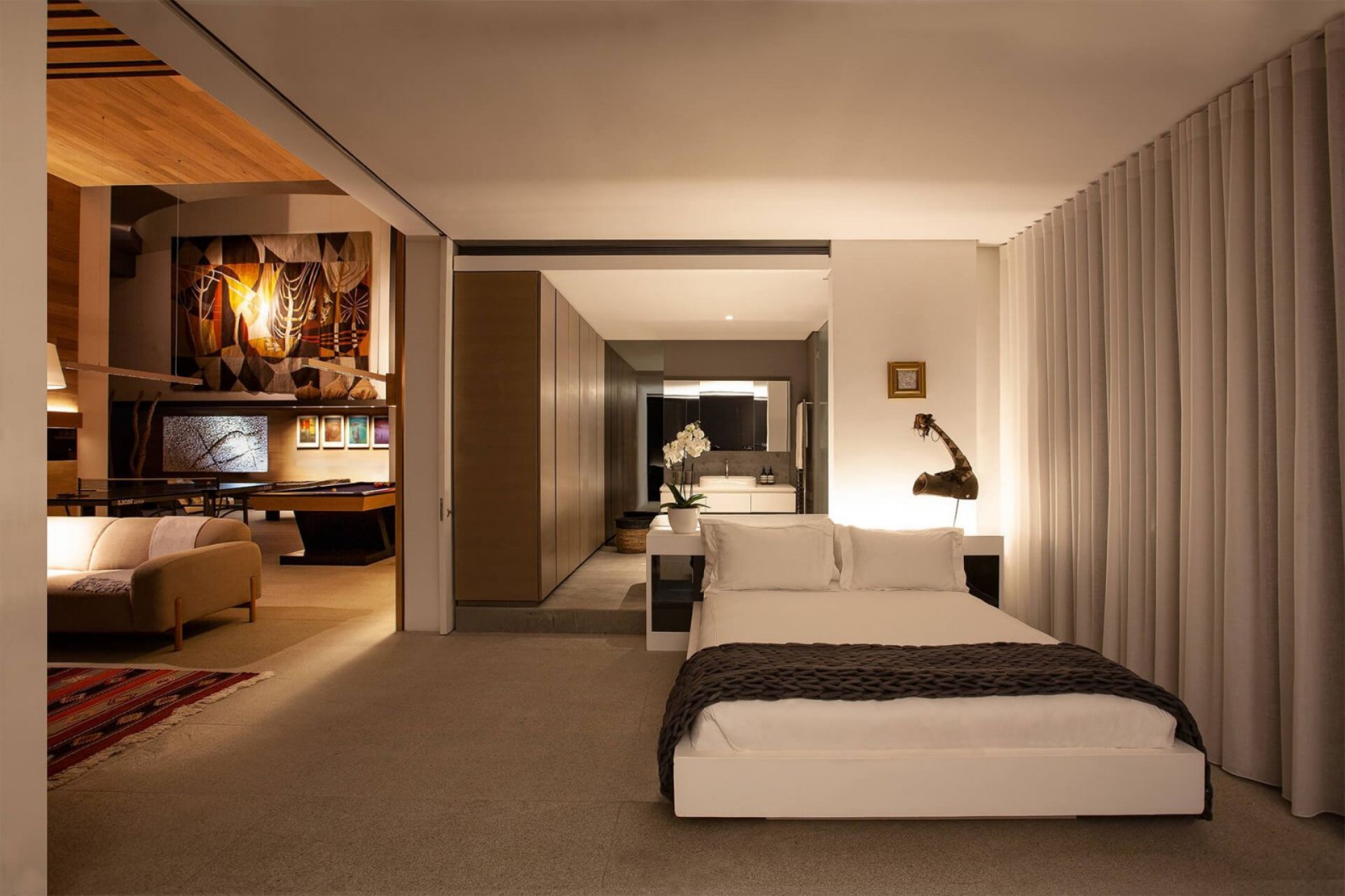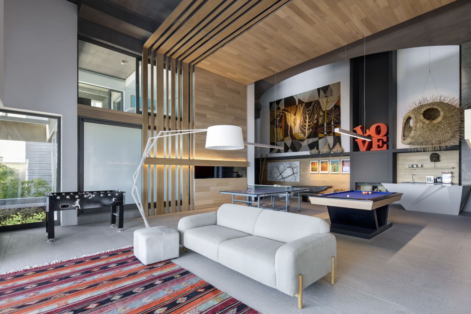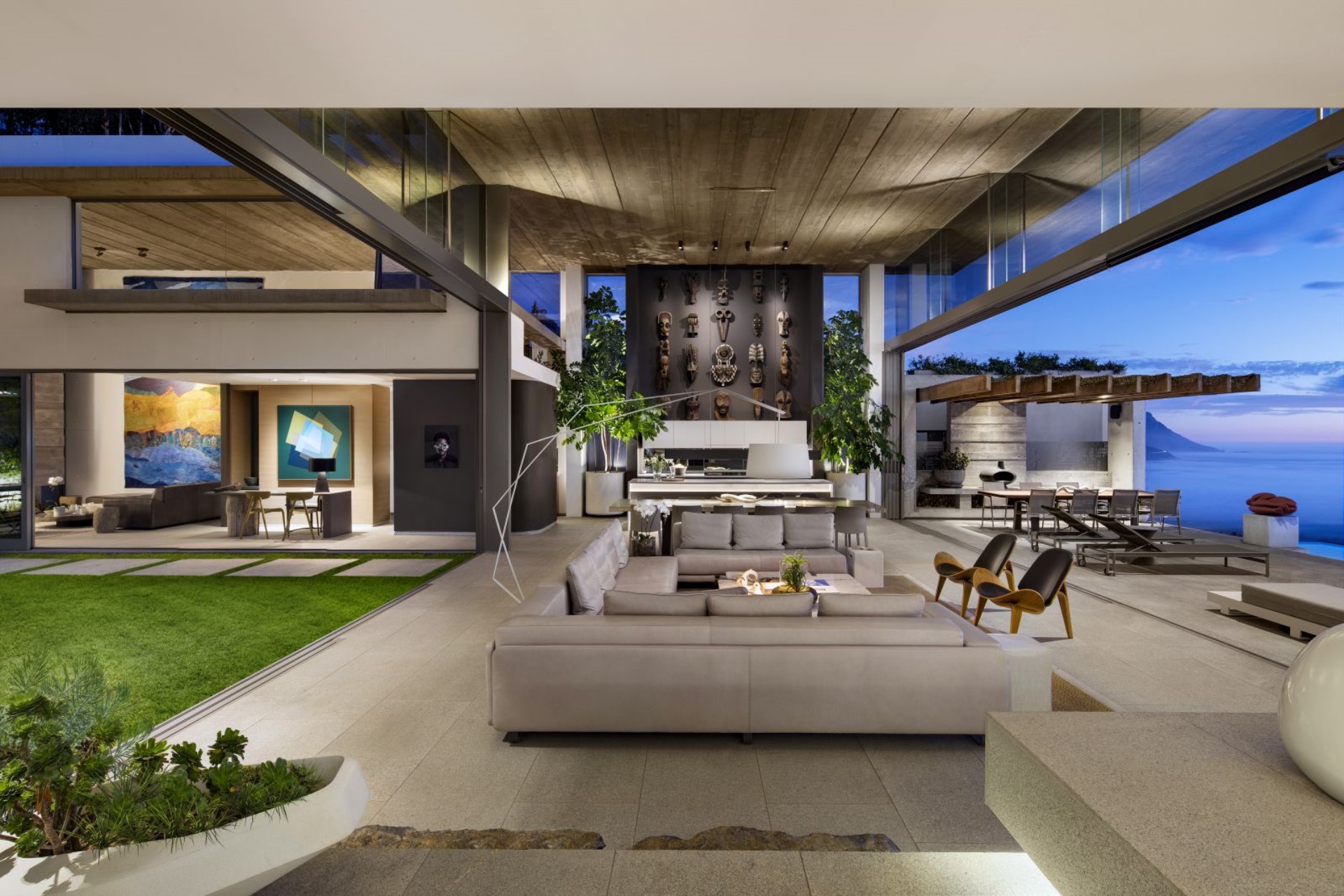 Leading into the villa, via a generous threshold featuring retractable walls, is the spectacular great room with a spacious seating area with expansive views outside. An additional dining space is also incorporated here, whilst a large green atrium sits adjacent, with a lush manicured lawn, ideal for private parties.