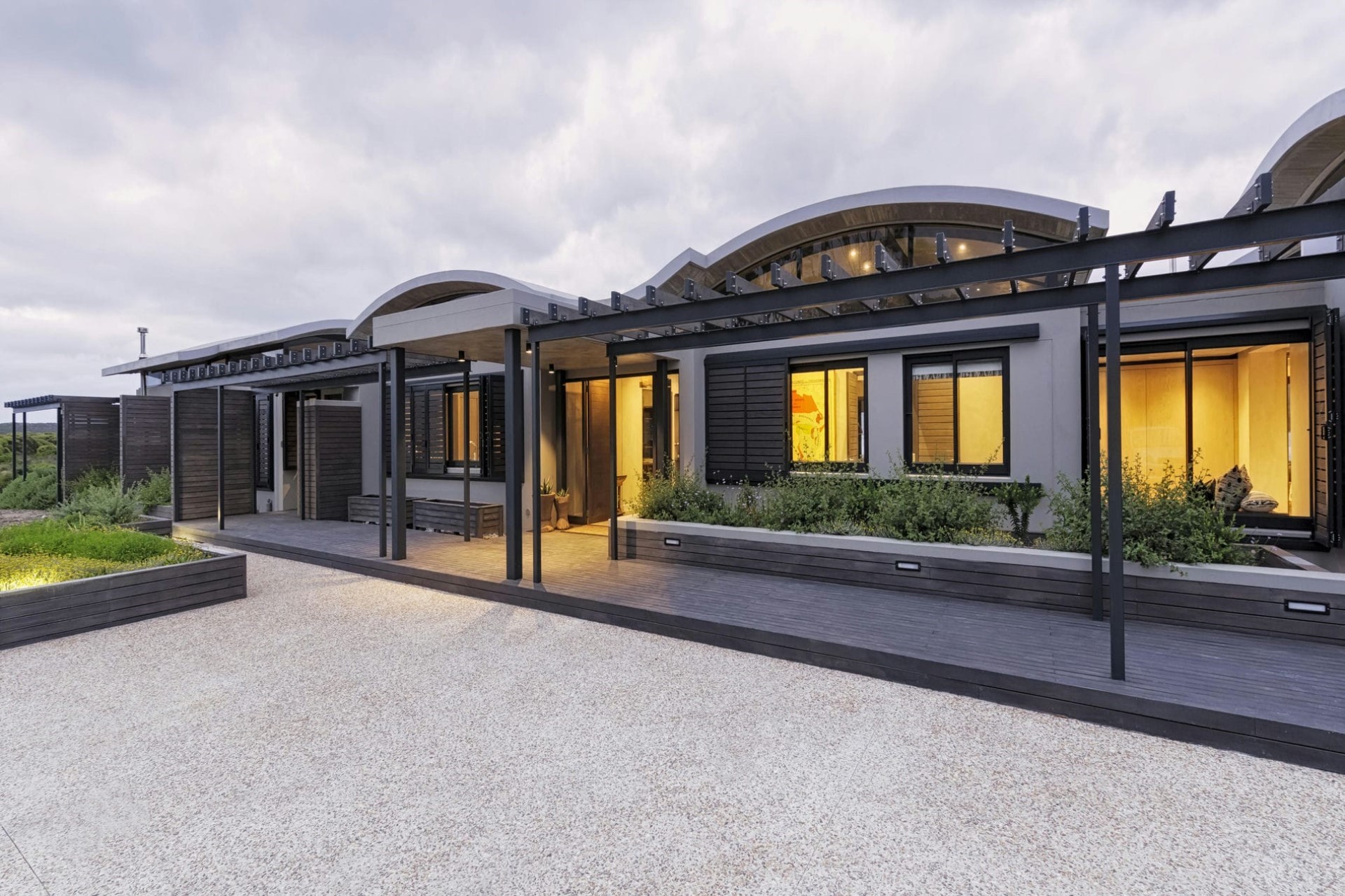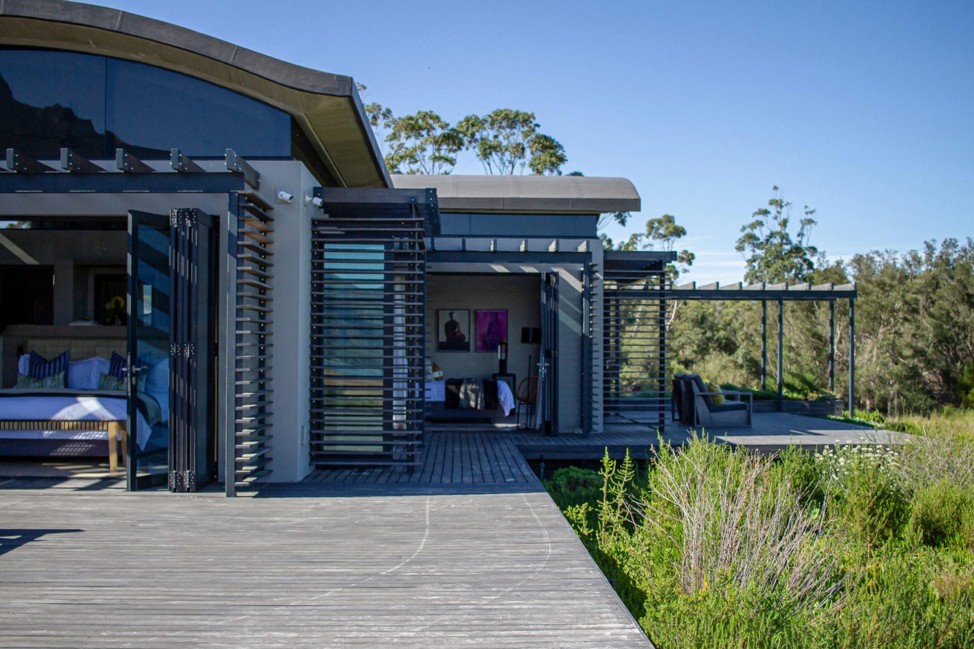 Set across one level with undulating rooftops, the villa fits unobtrusively into the landscape of rolling dunes. Wooden decking surrounds the property, offering plenty of space to relax surrounded by nature.
