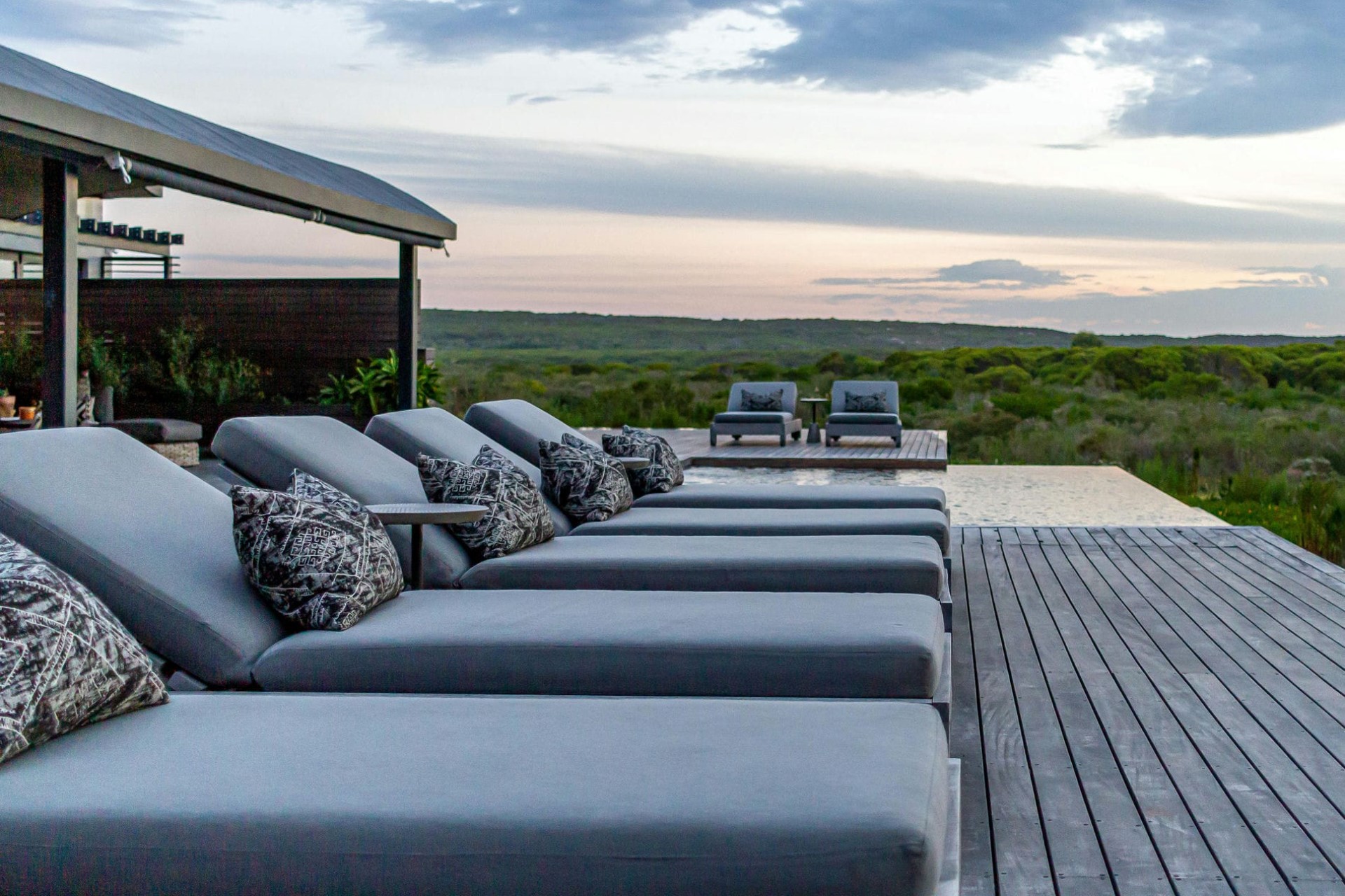 The warm waters of an infinity pool beckon, offering a serene space to take in the lagoon and mountain views before soaking up the rays from a poolside sun lounger. Behind the pool, a shaded outdoor living area with deep sofas offers respite from the sun, while the dining area is ideal for enjoying a casual barbecue – or braai – with loved ones.