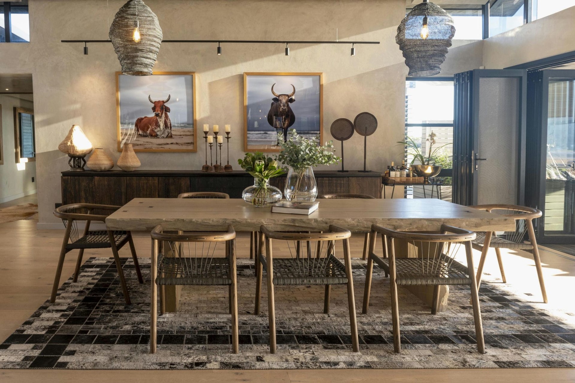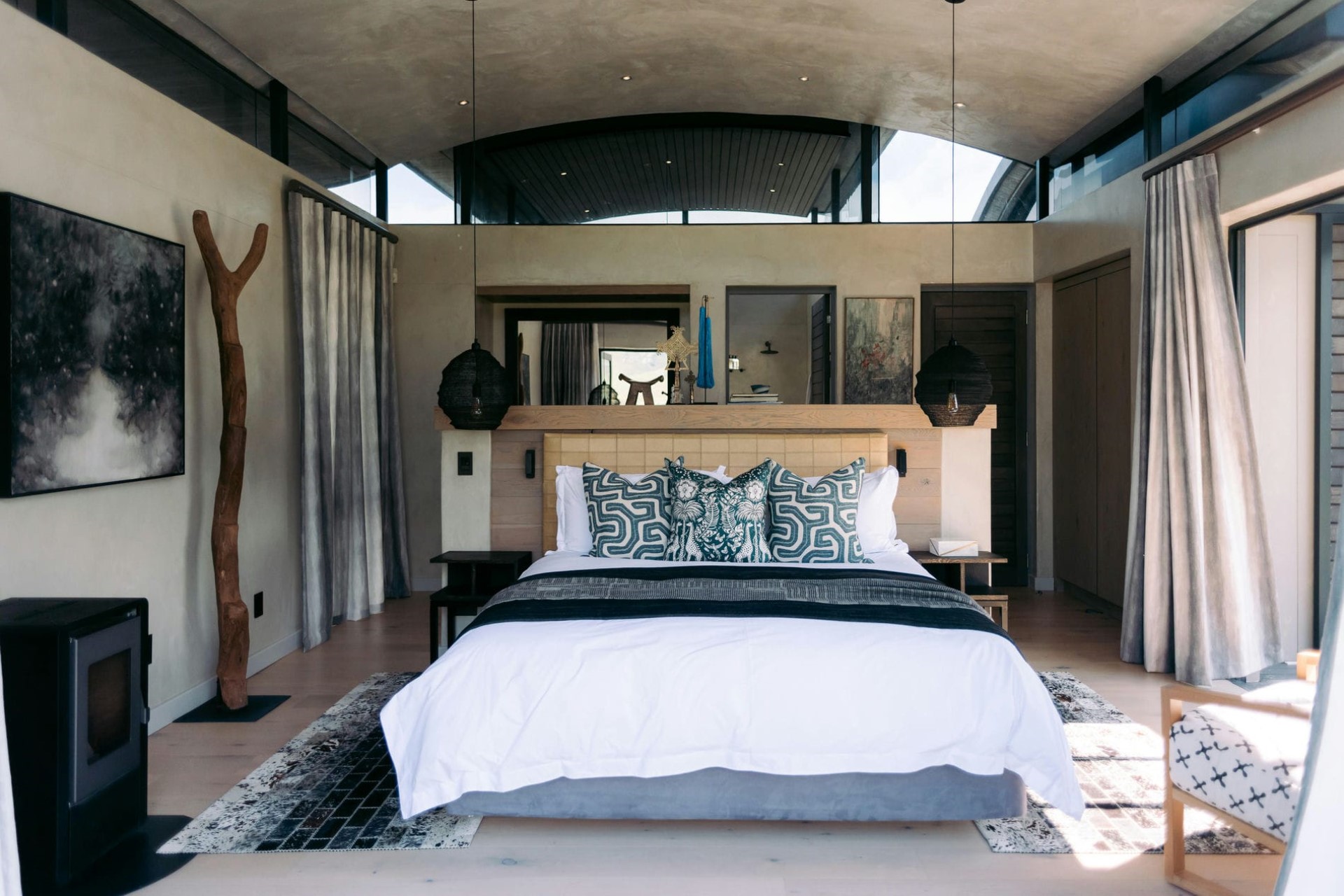 The villa interiors are contemporary and stylish, decorated with soft furnishings in natural textures and tones, and sustainably sourced African artefacts and artworks. The spaces are designed in a way that connects them with the surrounding nature, with floor-to-ceiling windows allowing for natural light and spectacular views from every angle.