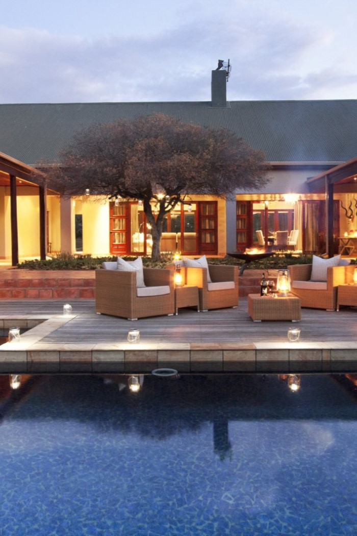 Melton Manor is a contemporary farmhouse that incorporates modern touches. Distinctively South African, this luxury villa features simple colonial furniture pieces combined with large comfortable sofas. The interior has a unique charm created by a blend of textured fabrics and different materials.