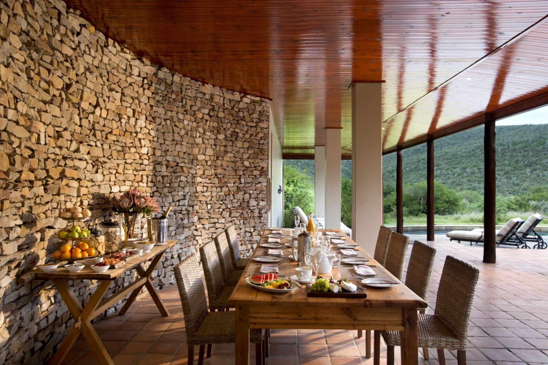 Guests can enjoy various communal living areas and are able to gather in the dining room with its farm-style kitchen or at the big farmhouse table on the terrace. As part of this special safari experience, guests can also choose to sample delicious meals at the picnic site at the mid-game drive.