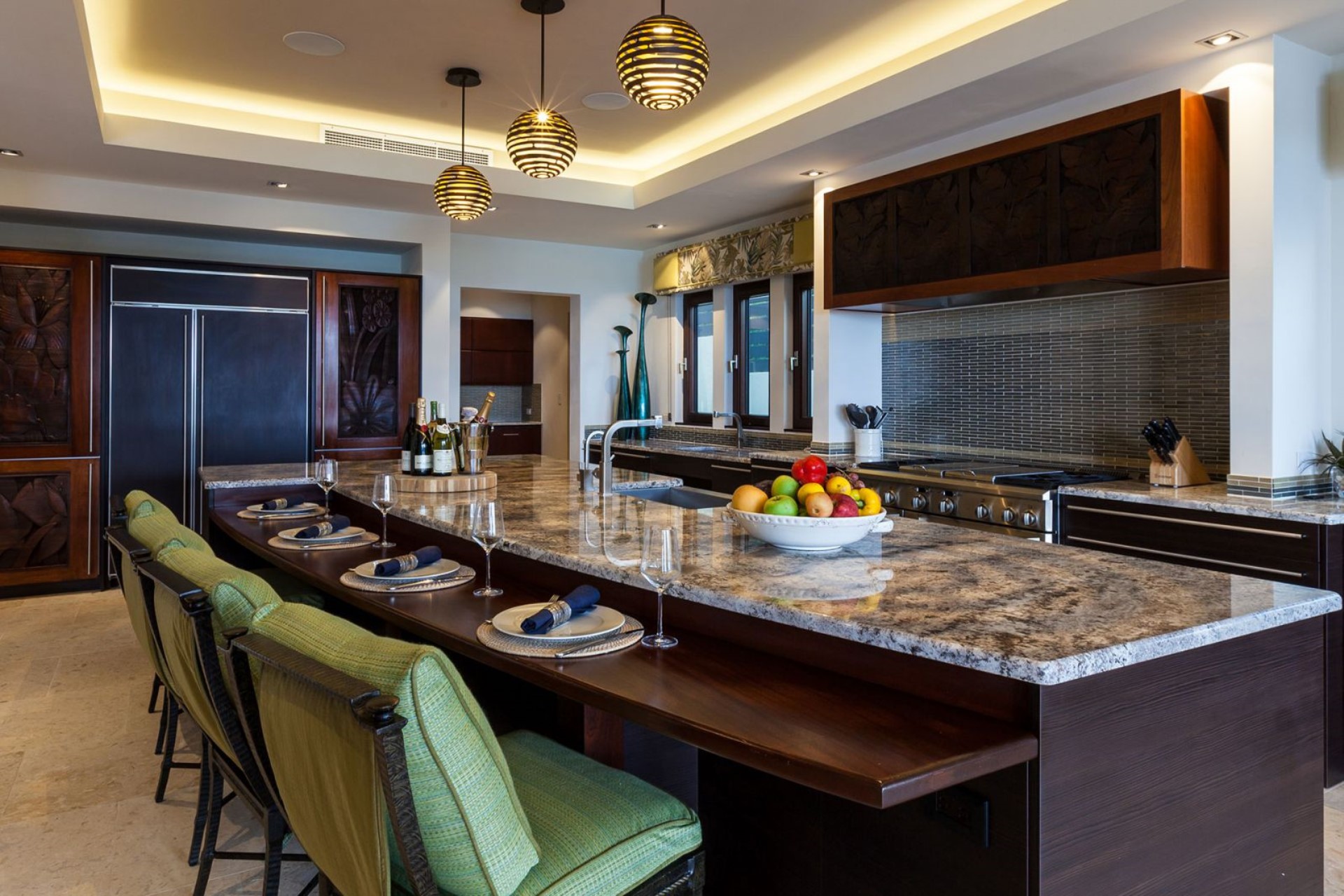 One of the villa’s most impressive features is the stunning multi-level swimming pool, ideal for keeping guests of all ages relaxed and entertained. It features an infinity-edge upper pool with children’s splash area and hot tub, a lower level plunge pool, and a hidden grotto behind a waterfall.