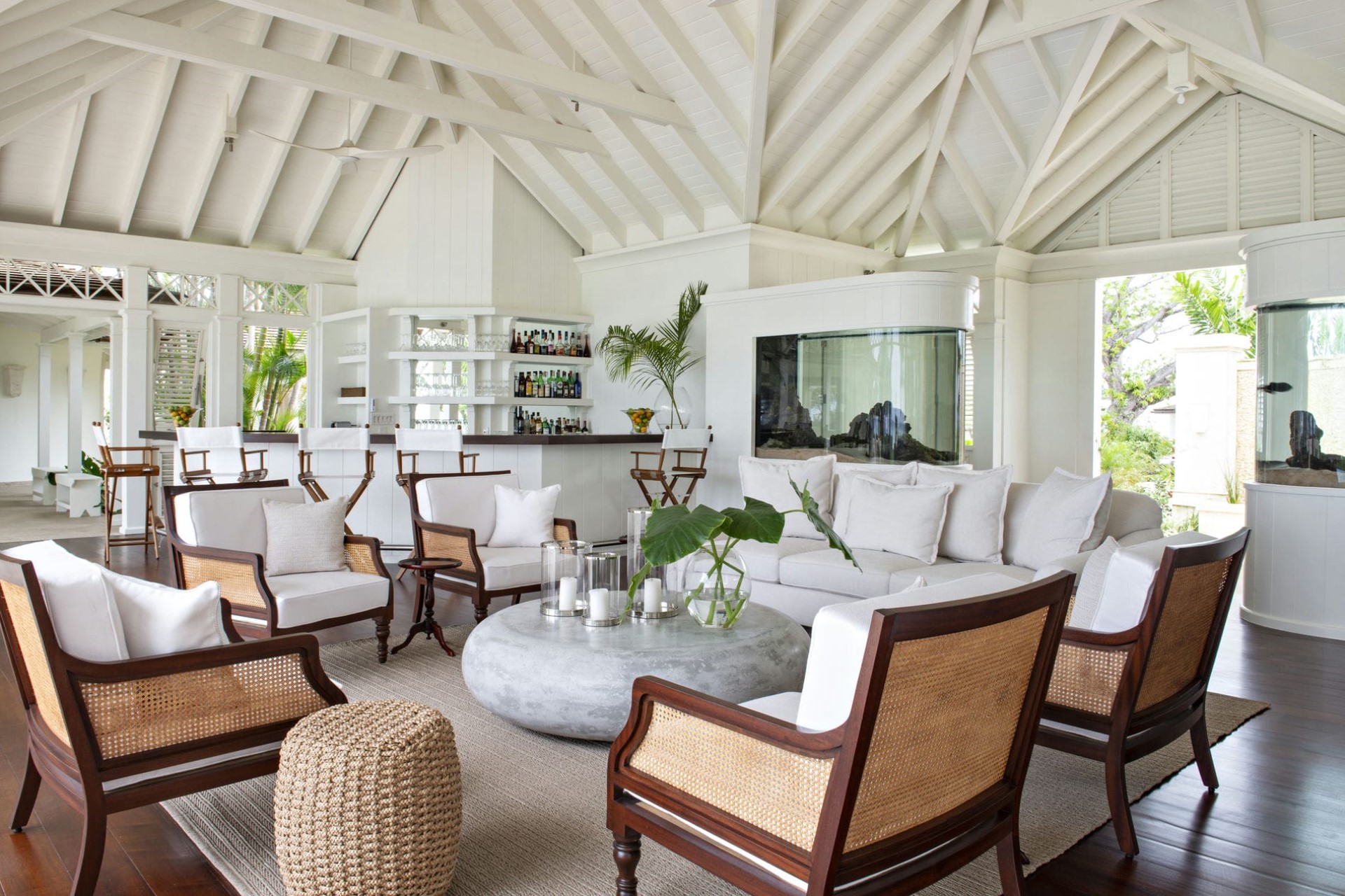 On the water side, a large infinity pool is flanked by a sprawling deck dotted with sun loungers. A beachfront bar is perfect for enjoying relaxed drinks and woodfire pizzas, whilst multiple shady gazebos offer plenty of space for al fresco dining, socialising, and entertaining. The pool area leads through to a central bar flanked by vibrant aquariums.