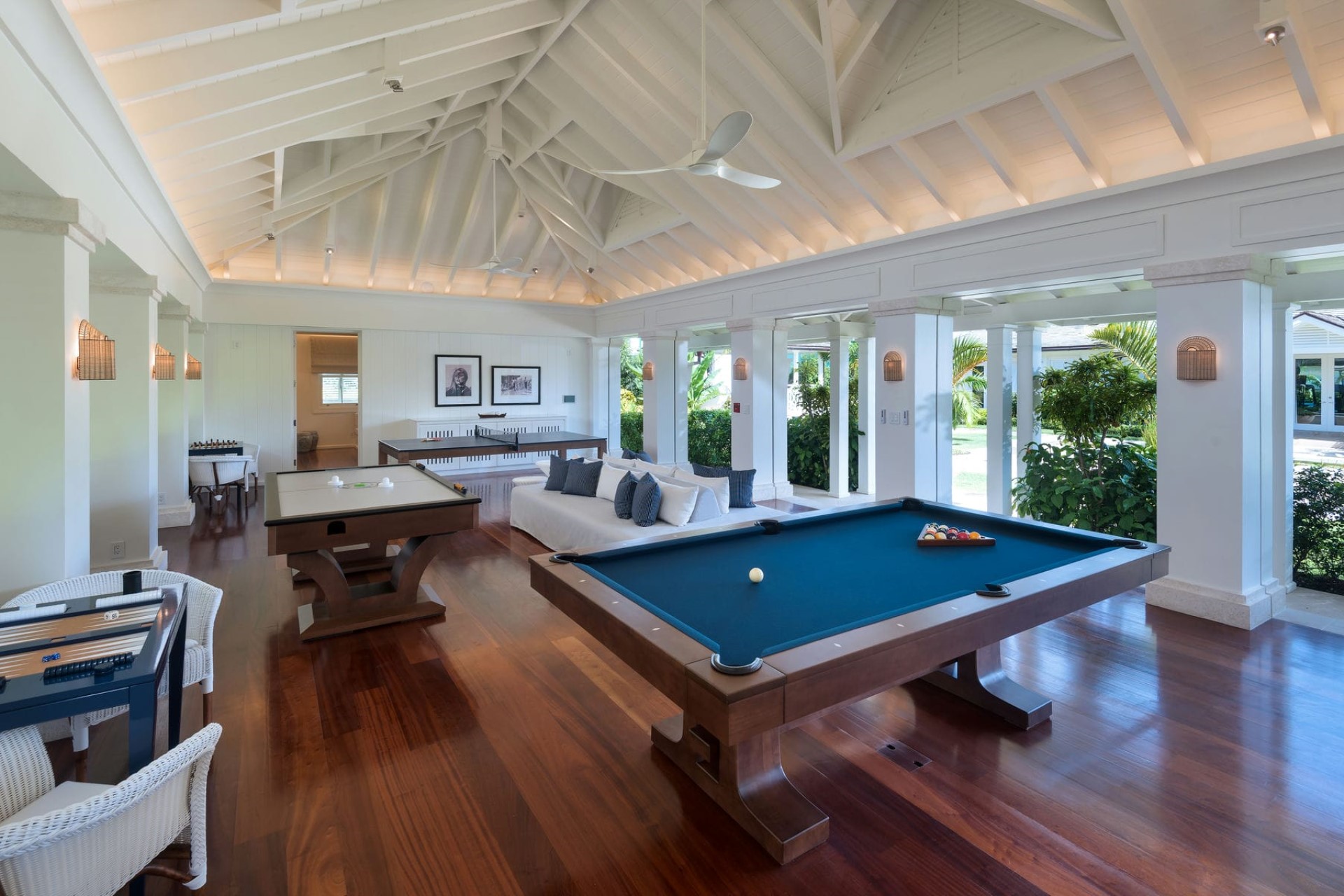 On the land side, guests can enjoy manicured gardens and verdant lawns dotted with lily ponds. Amongst these are a floodlit, US Open-style tennis court and a large games room with a pool table, air hockey, table tennis set and more to entertain all ages. Moreover, guests can enjoy a cinema room, a fully-equipped gym, and a spa room for luxurious treatments. For corporate groups, there is also a library and a conference room with a workstation perfect for meetings and remote working.
