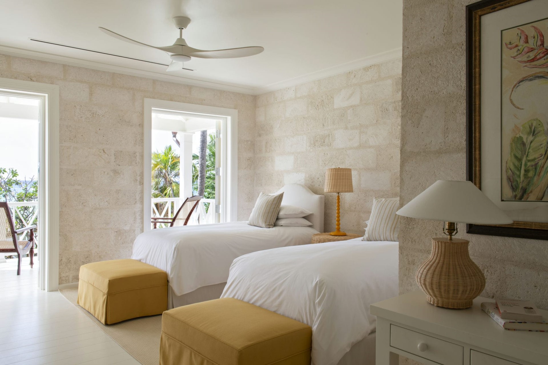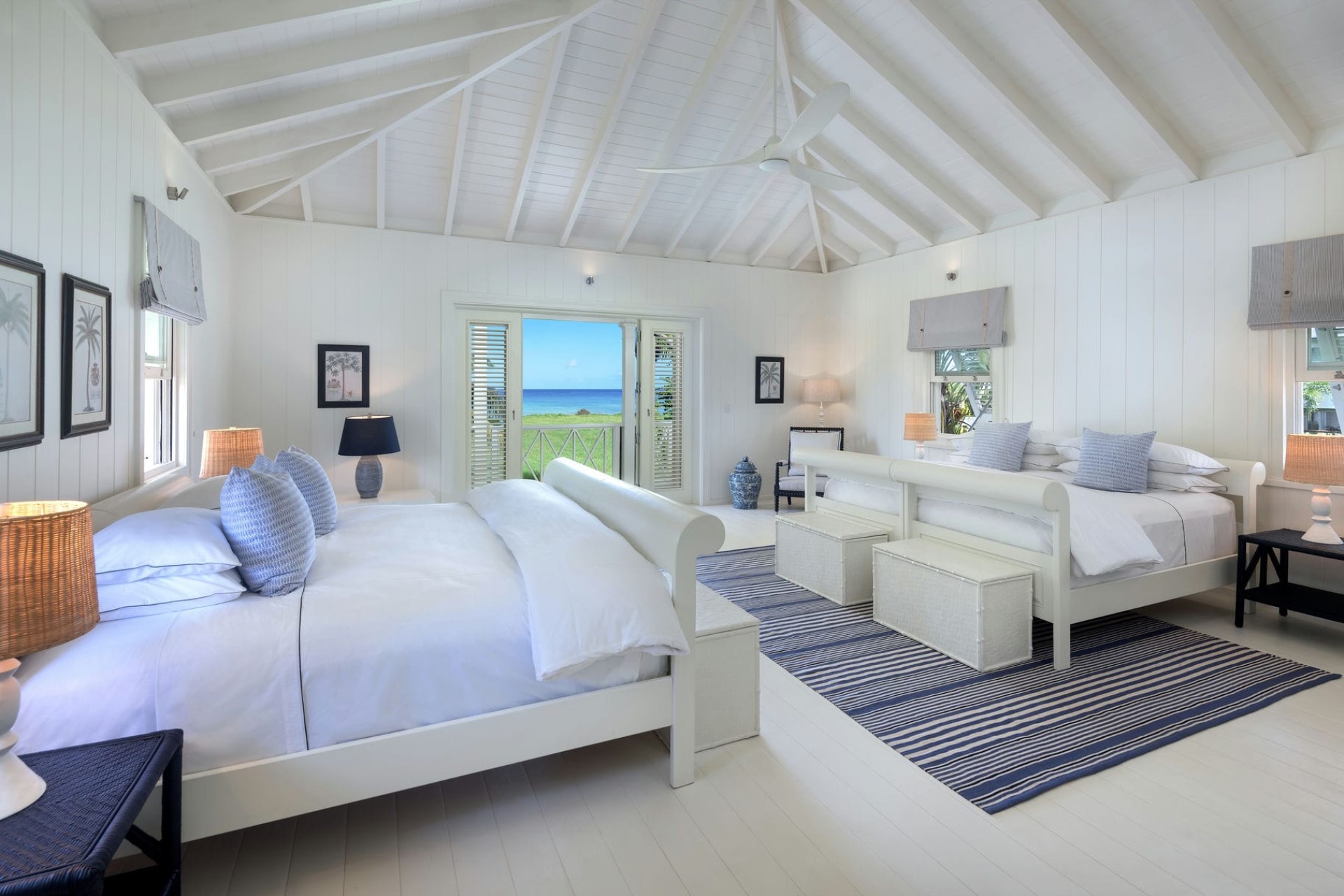 Carriage House Upper Suite – 2 x king-size bed (converted to 4 x twin beds on request), en-suite bathroom with dual vanity & bathtub/shower, and private balcony with sea views