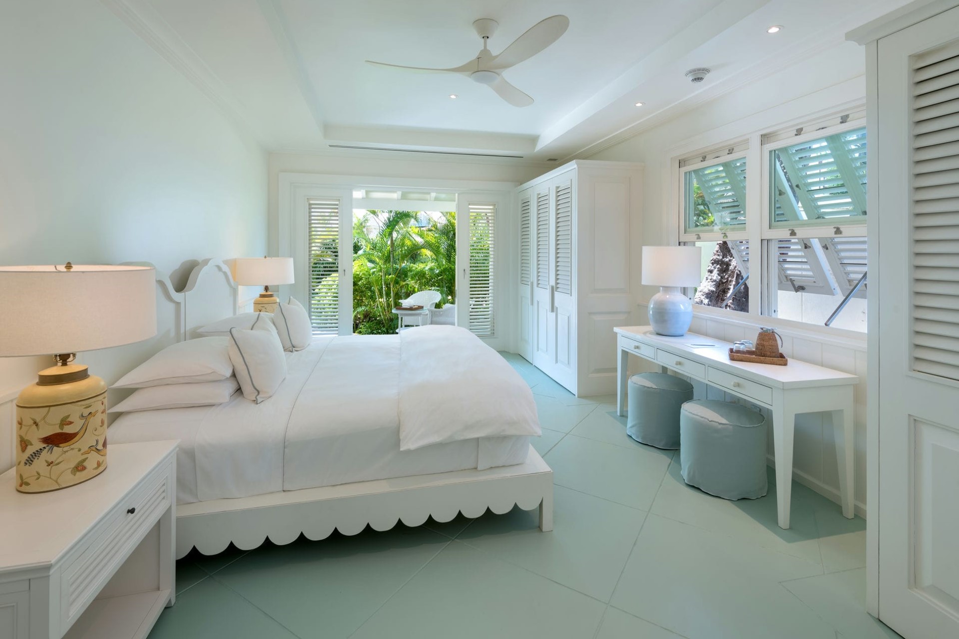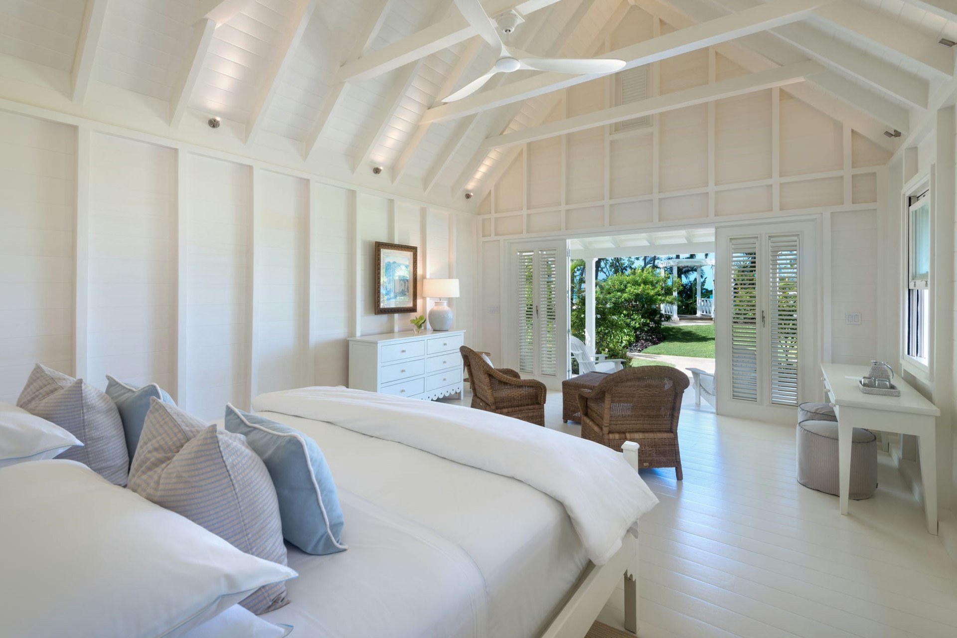 The Great House Garden Suite – king-size bed, en-suite bathroom with dual vanity & shower, and private terrace with garden views (wheelchair accessible room)