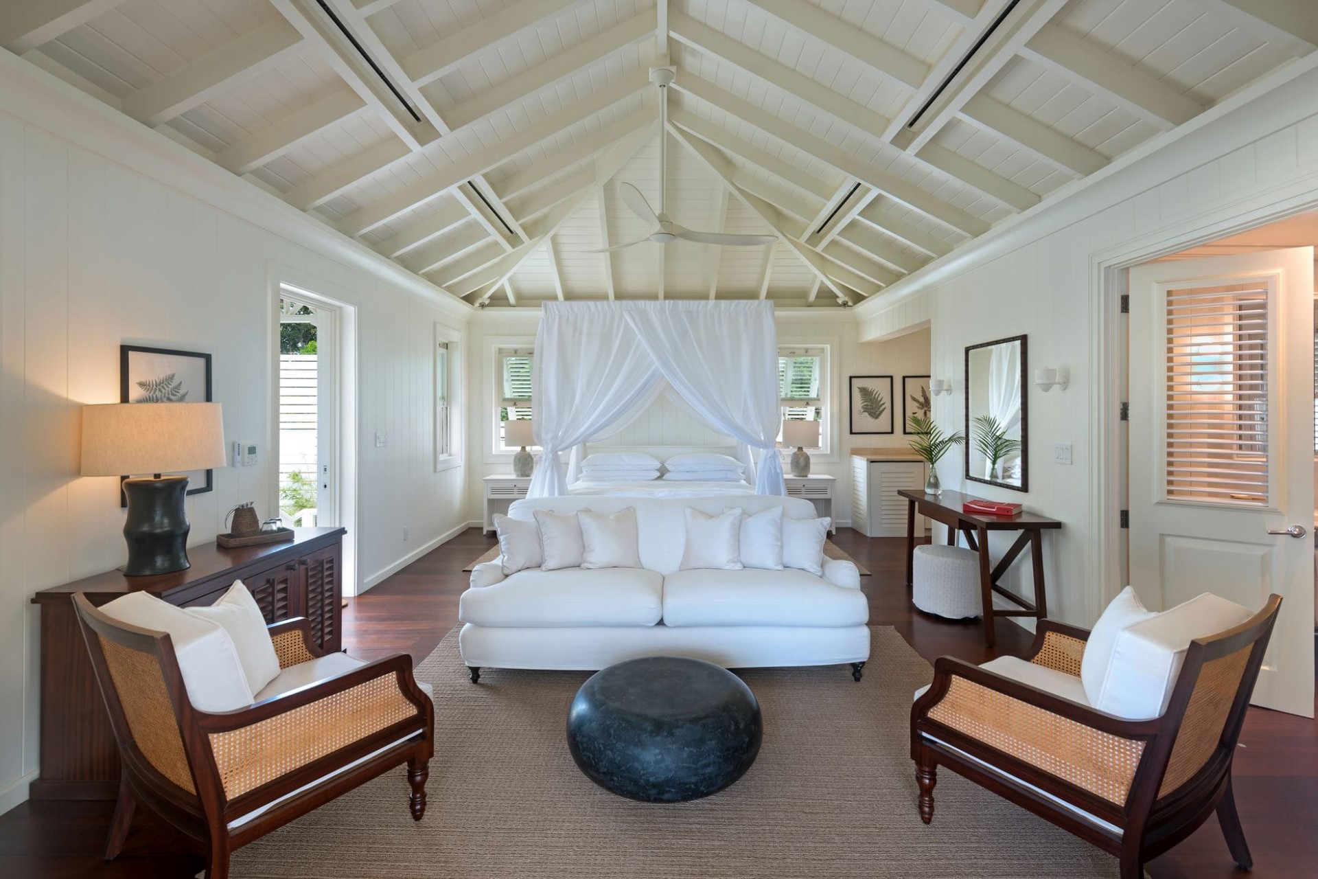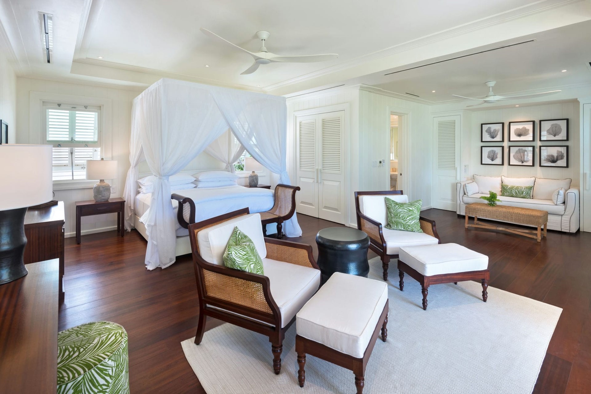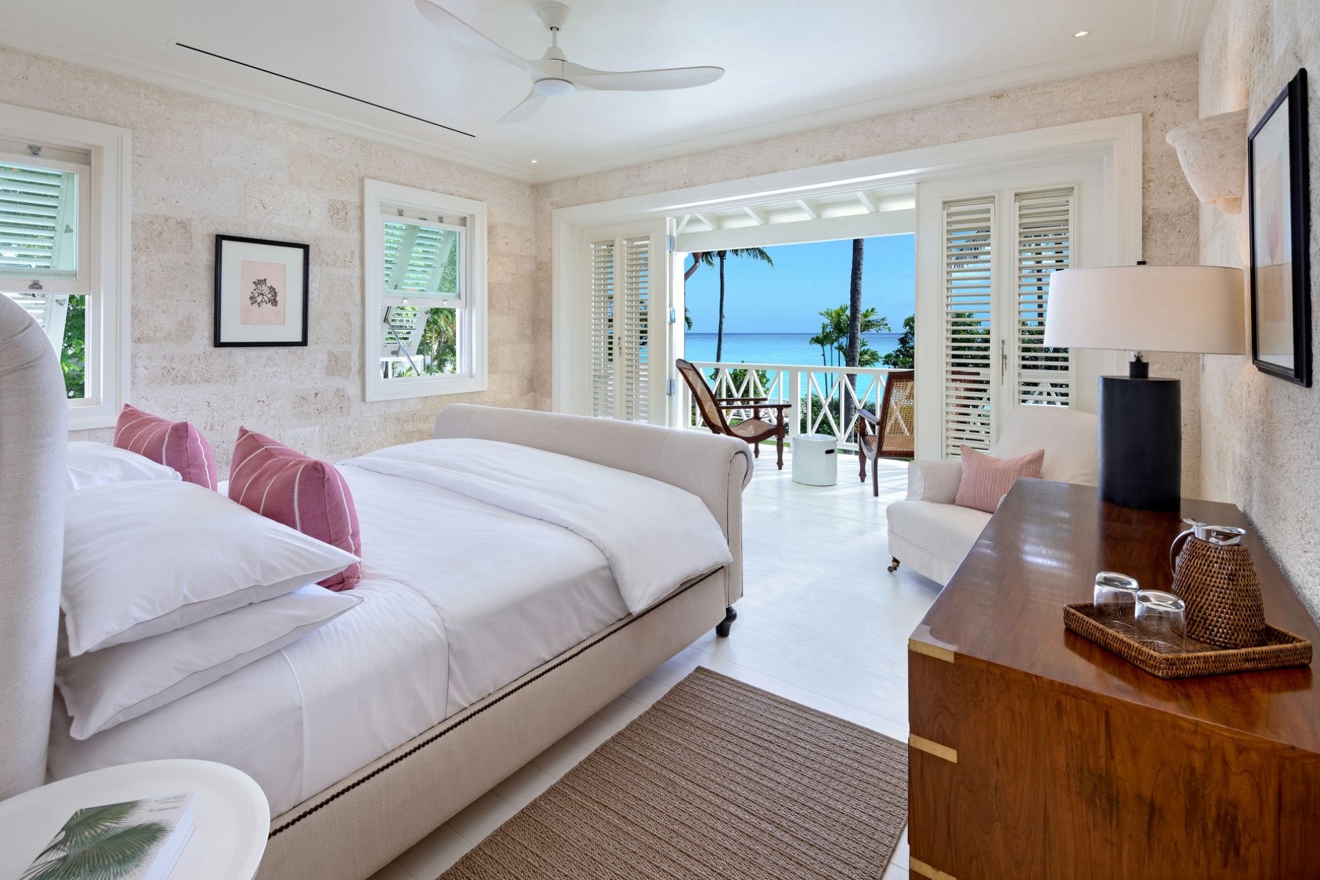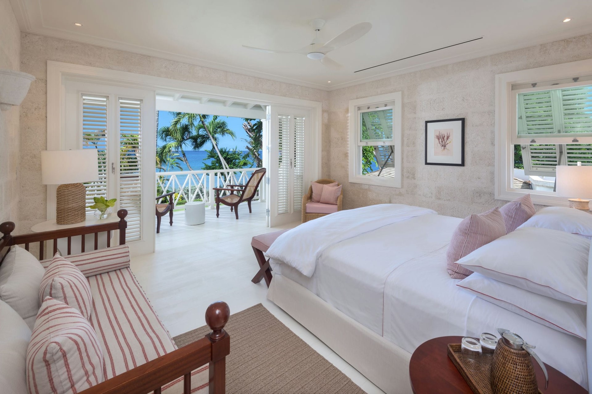 The Great House North Suite – king-size bed, sitting areas, en-suite bathroom with shower, and private balcony with sea views