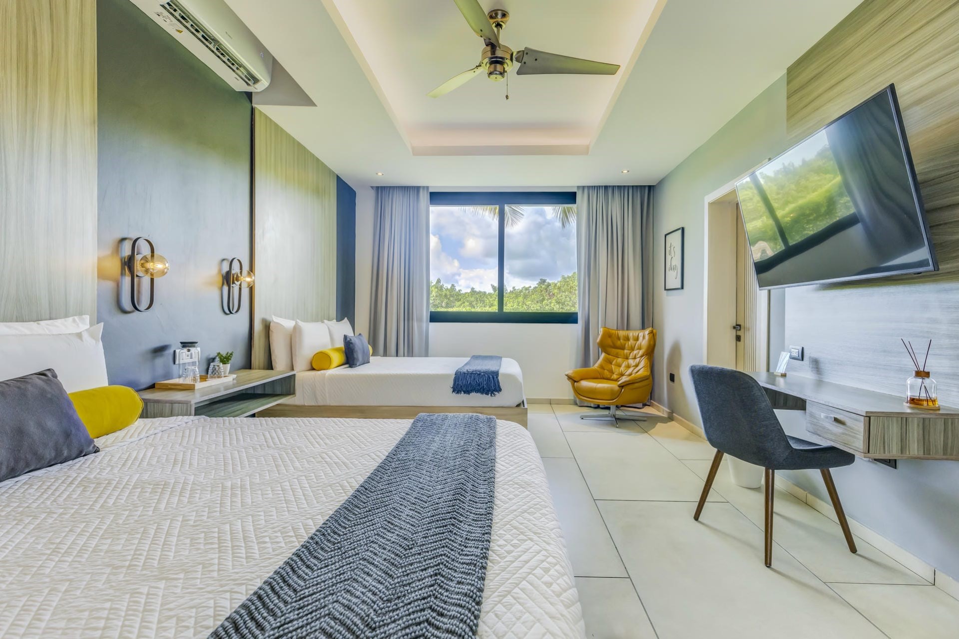 Bedroom 9 (Family) – 2 x queen-size beds + 2 x single bunk bed, en-suite bathroom with shower, and terrace access