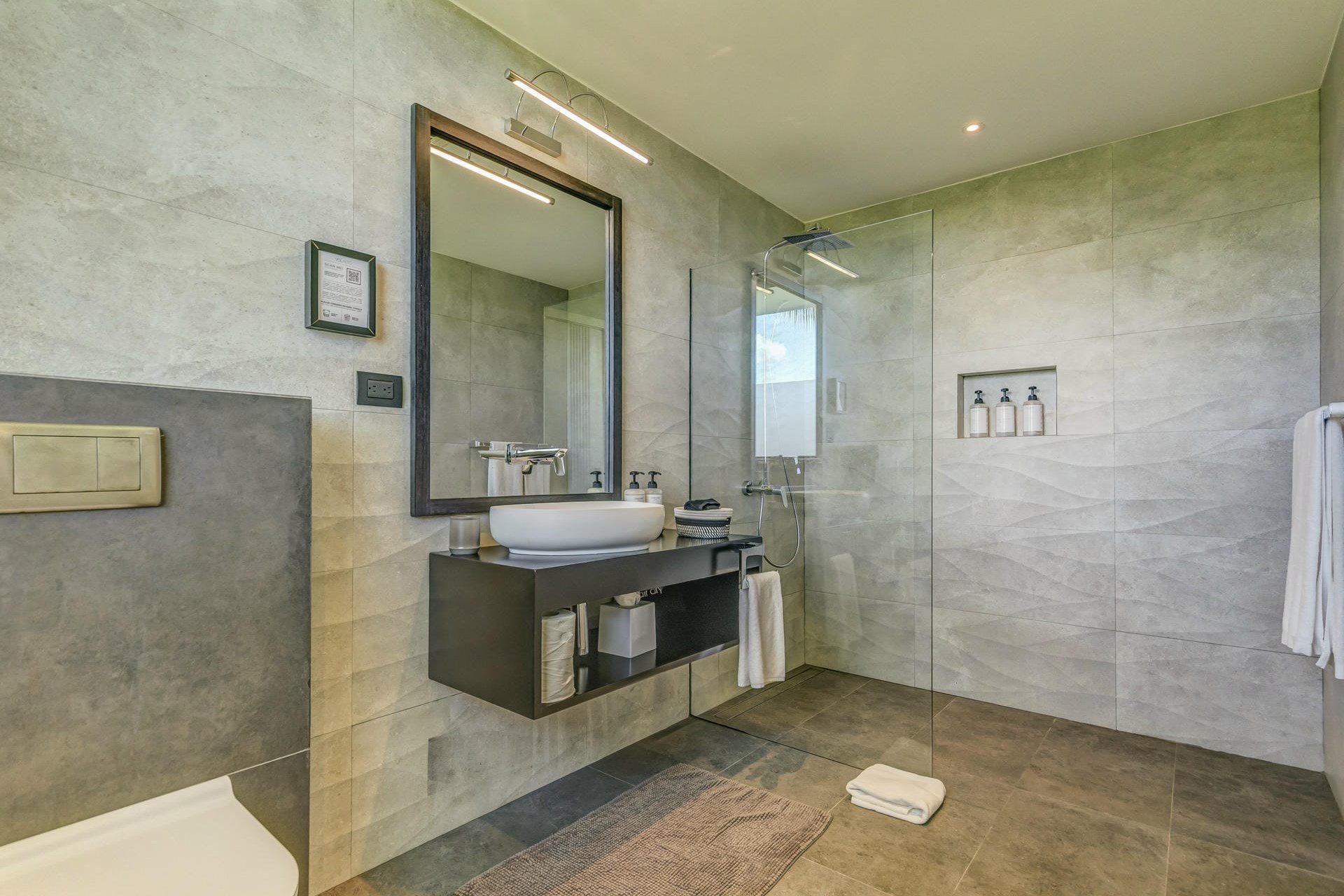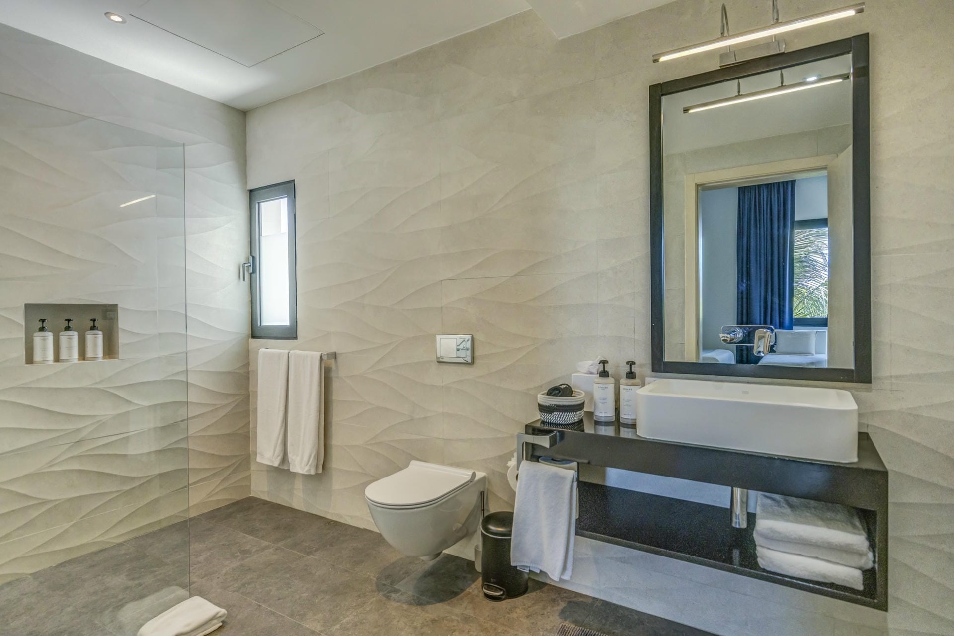 Bedroom 1 (Master) – king-size bed, walk-in wardrobe, en-suite bathroom with shower, and private terrace