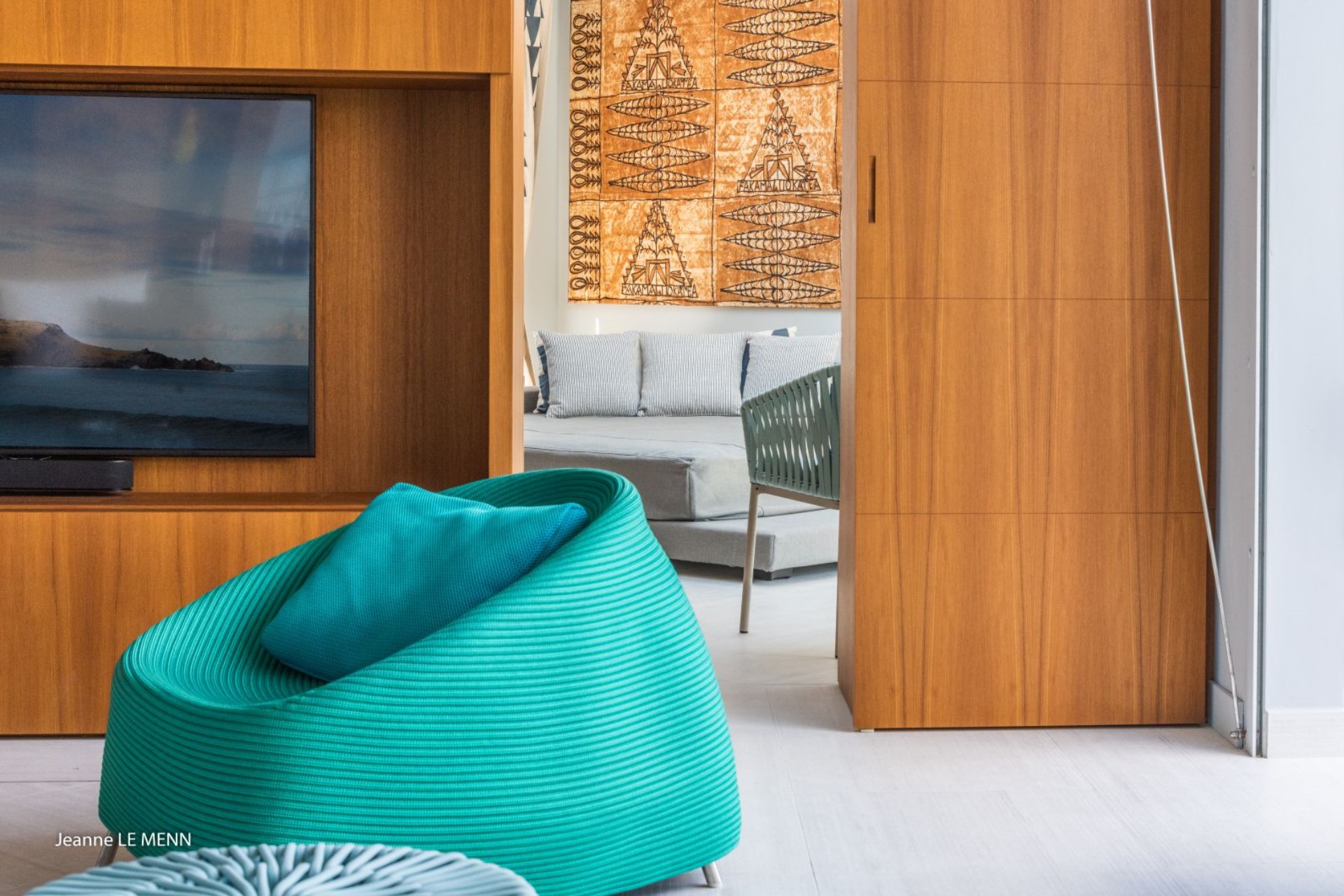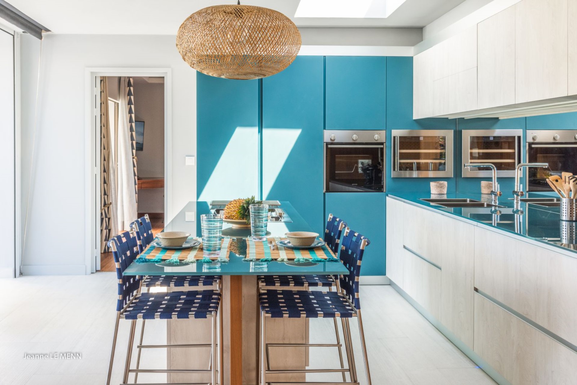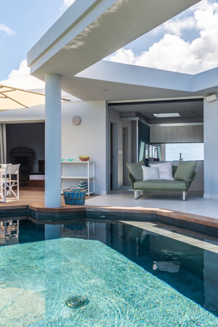 Indoors, the living areas are open-plan with floor-to-ceiling doors to the terraces, creating a bright an airy atmosphere. Guests can enjoy a film in the spacious lounge, cook up a feast in the modern, fully-equipped kitchen, or dine at the casual indoor dining table.