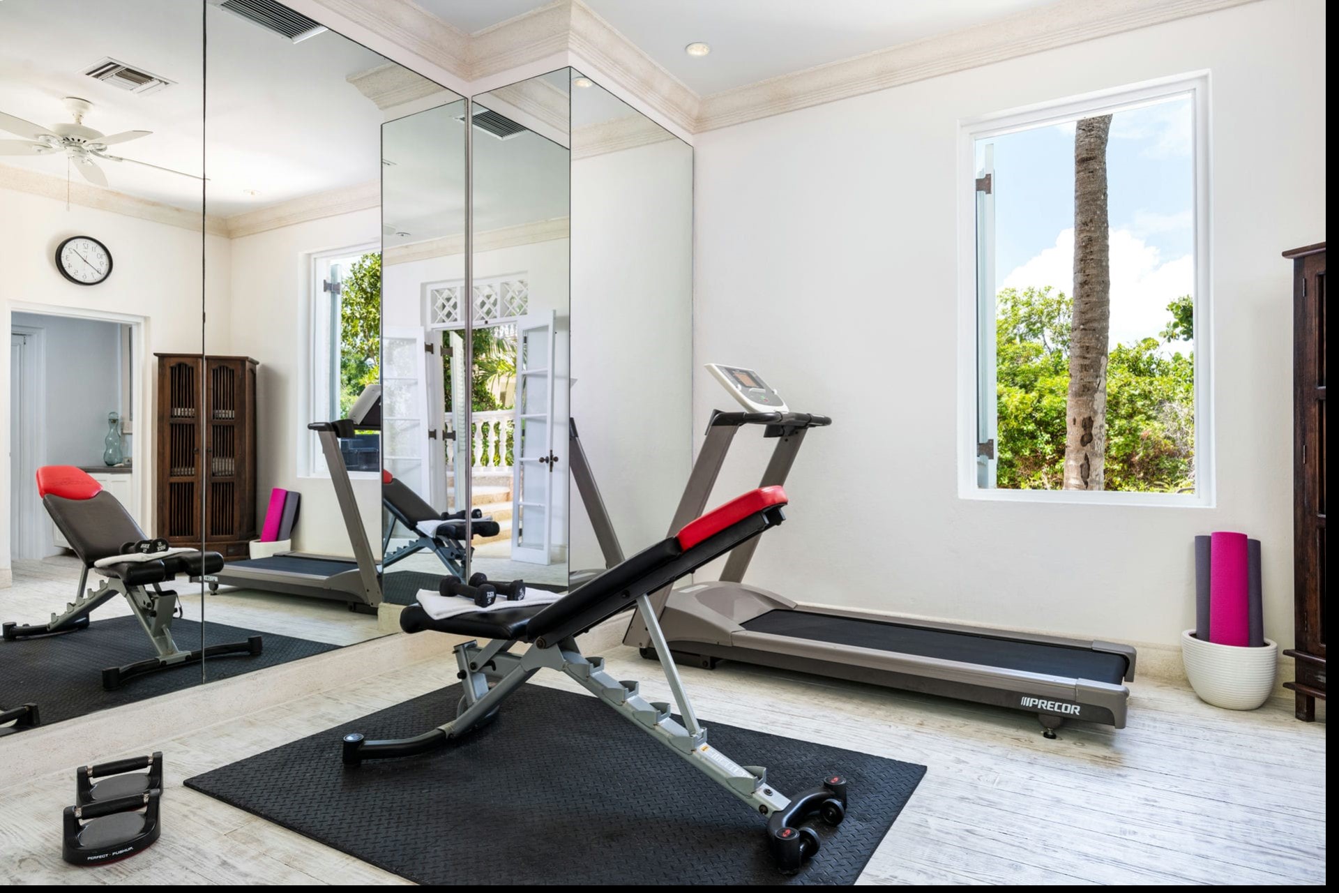 There is also a cinema room with cable and Apple TV, a fully-equipped kitchen with breakfast nook, a wet bar, and a small but well-fitted workout area.