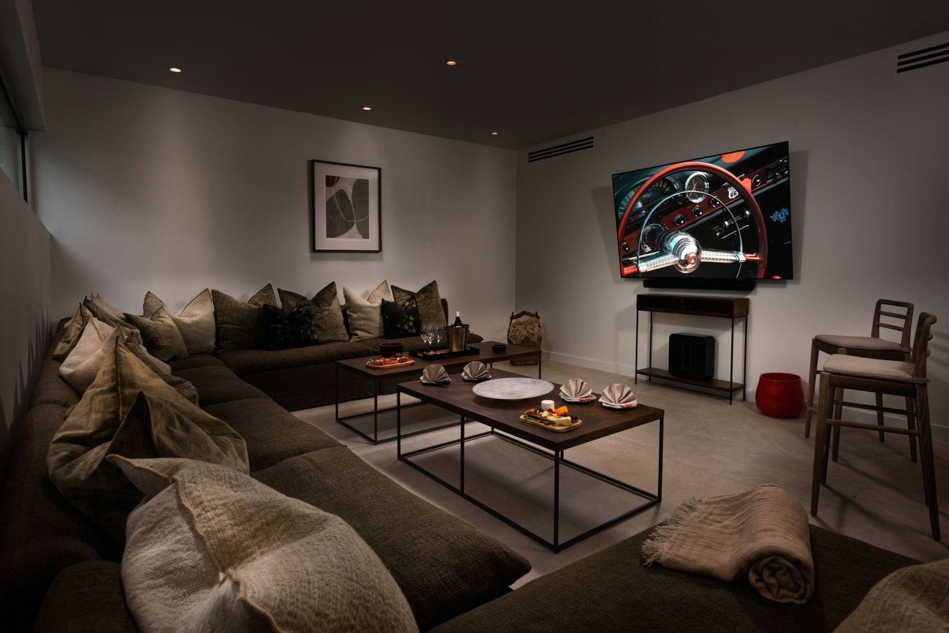 Moreover, the ground floor is home to a media room with a large TV, a surround sound system, and plush sofas, perfect for cosy film nights, plus a conference room ideal for corporate retreats.