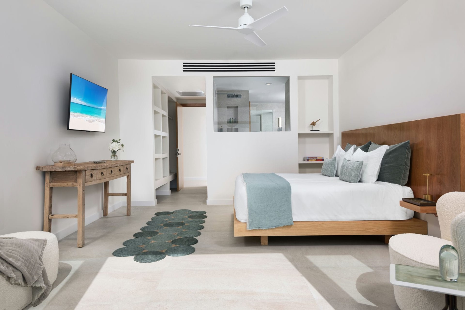 Master Bedroom 2 – king-size bed, sitting area with sofa bed, walk-in wardrobe, en-suite bathroom with shower, private terrace, and Chalk Sound views