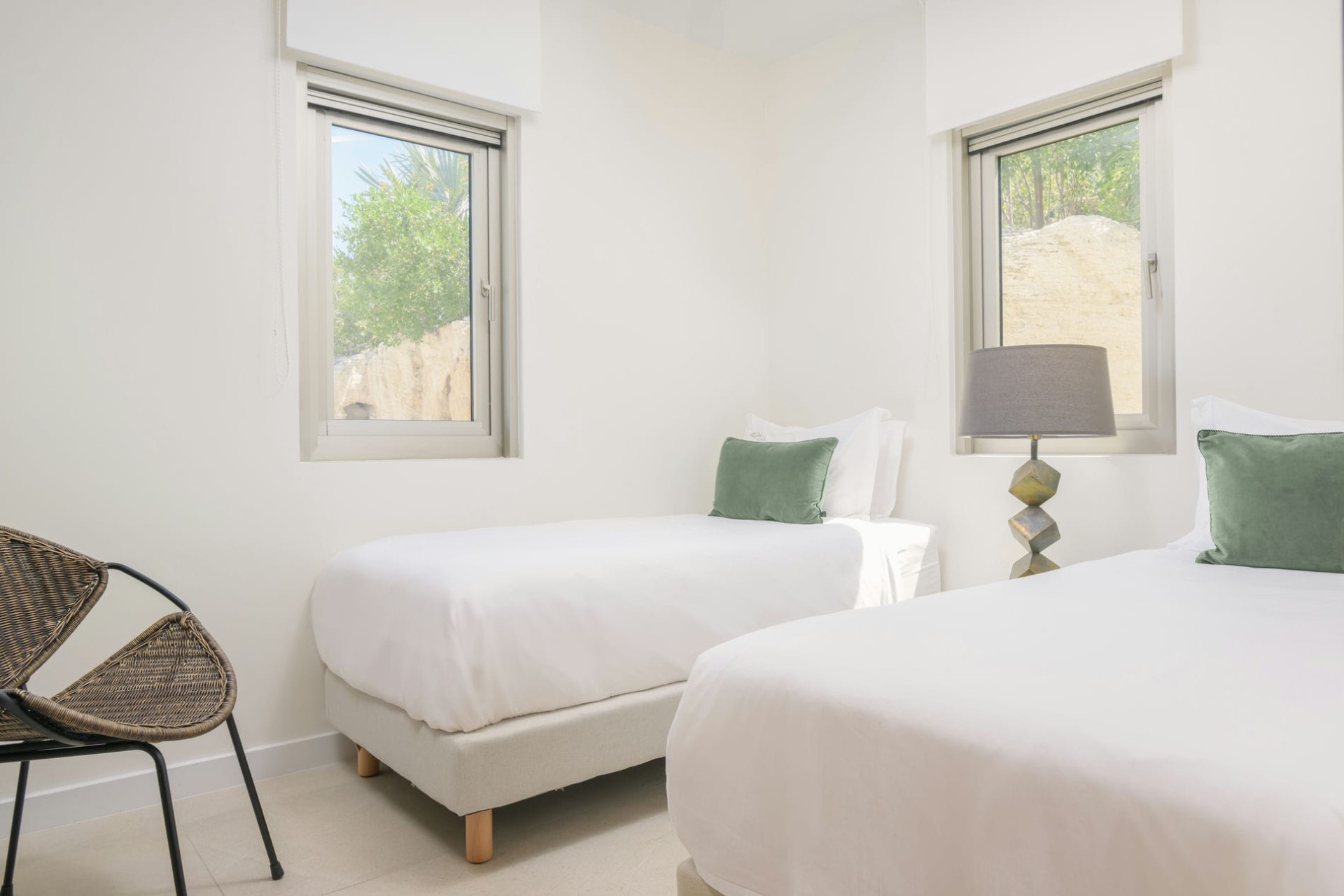 Bedroom 8 – twin beds (converted to one king-size on request), shared bathroom with shower, and garden views