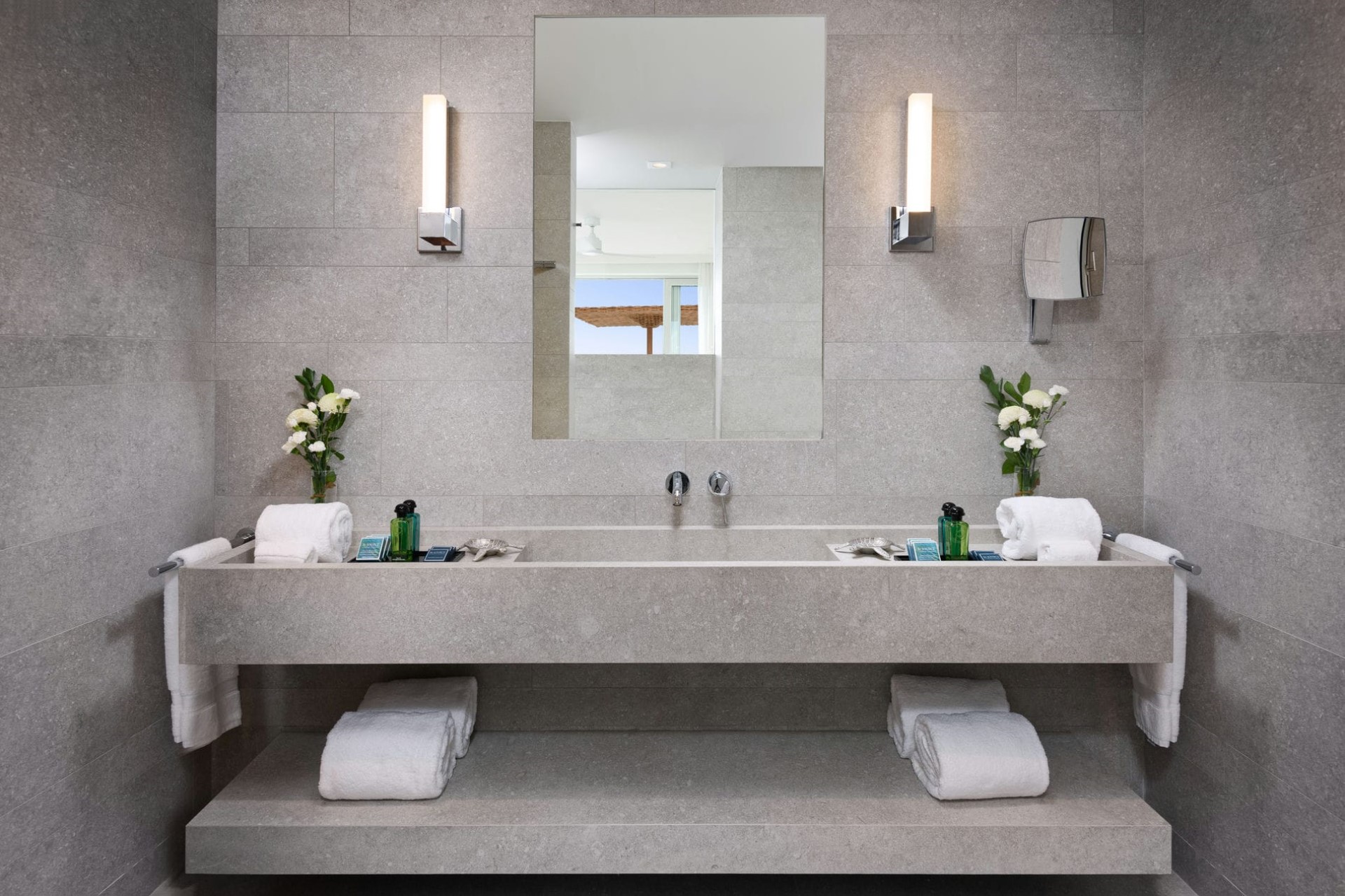Bedroom 5 – 3 x bunk beds (sleeps 6), en-suite bathroom with dual vanity, bathtub & separate shower, terrace access, and ocean views