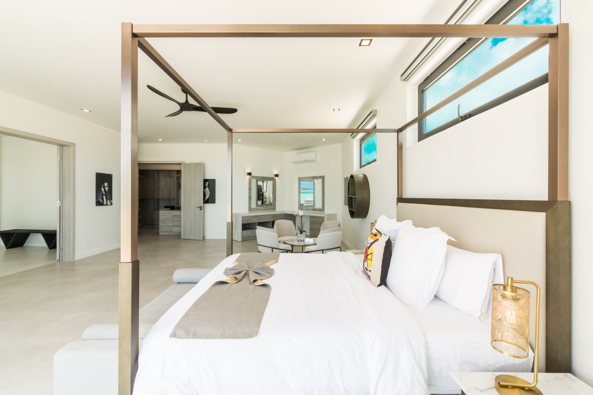 Bedroom 1 (Penthouse Suite) – king-size bed, desk, sitting area, private kitchenette, dressing room, en-suite bathroom with bathtub & separate shower, and private terrace with ocean views