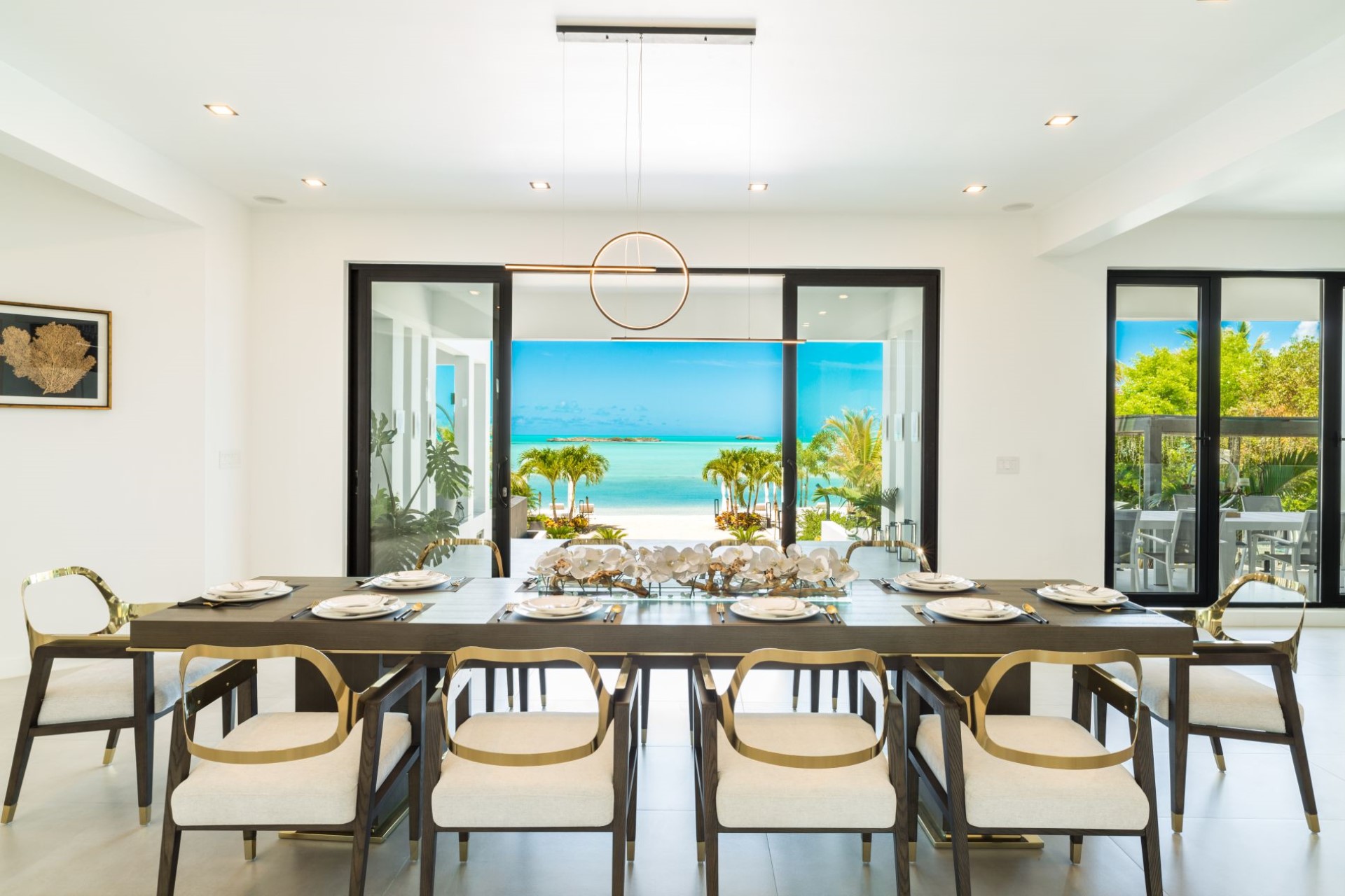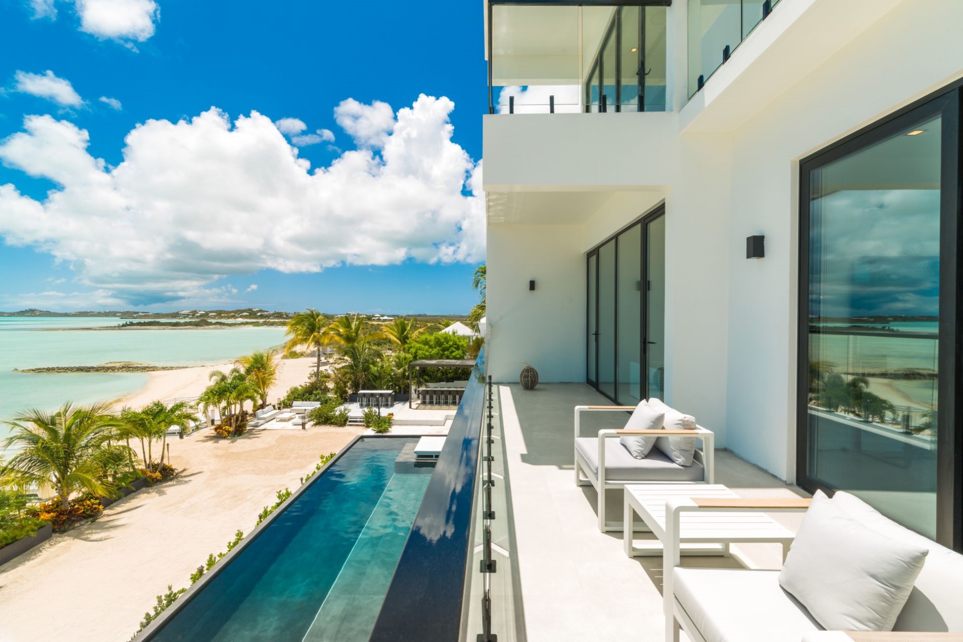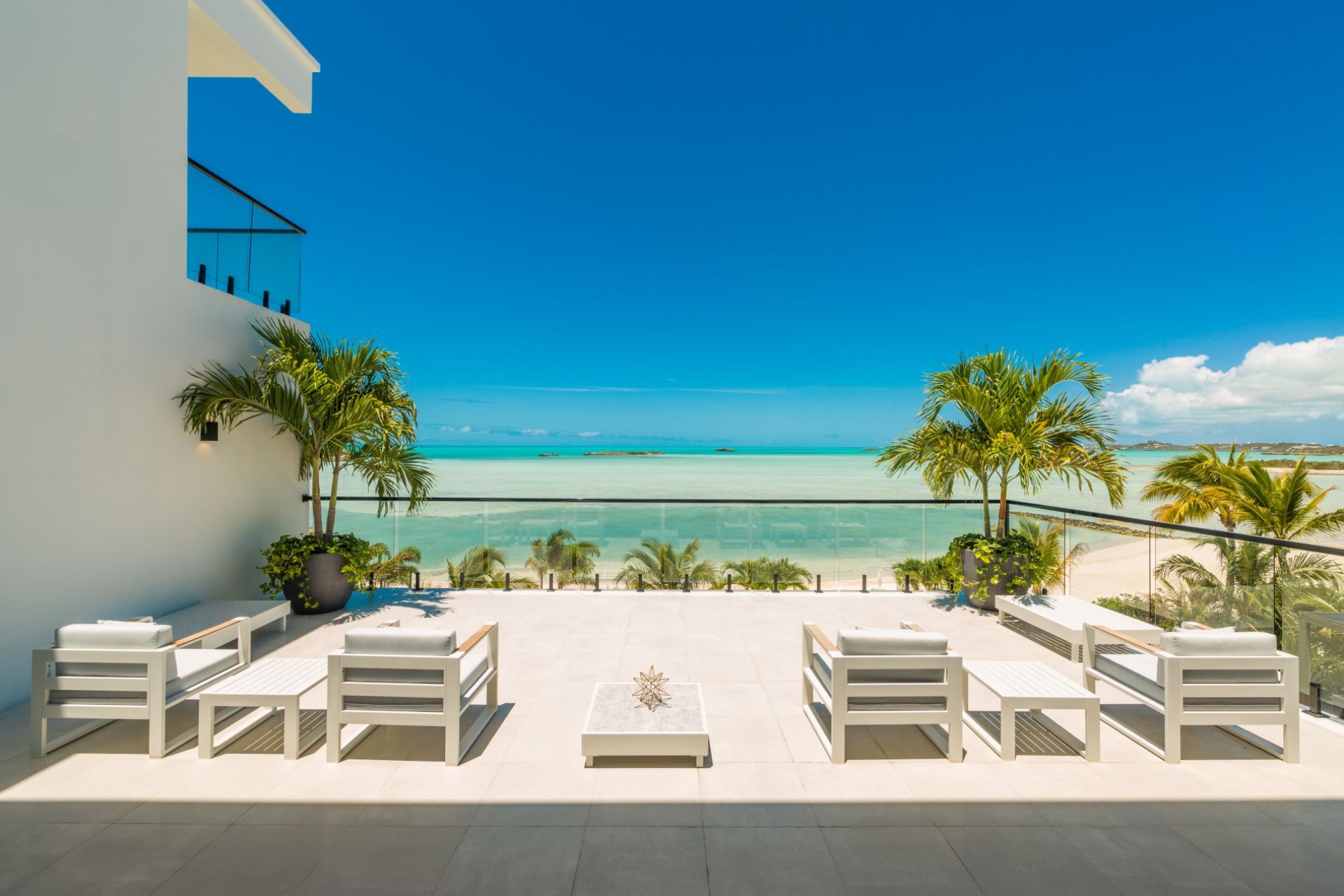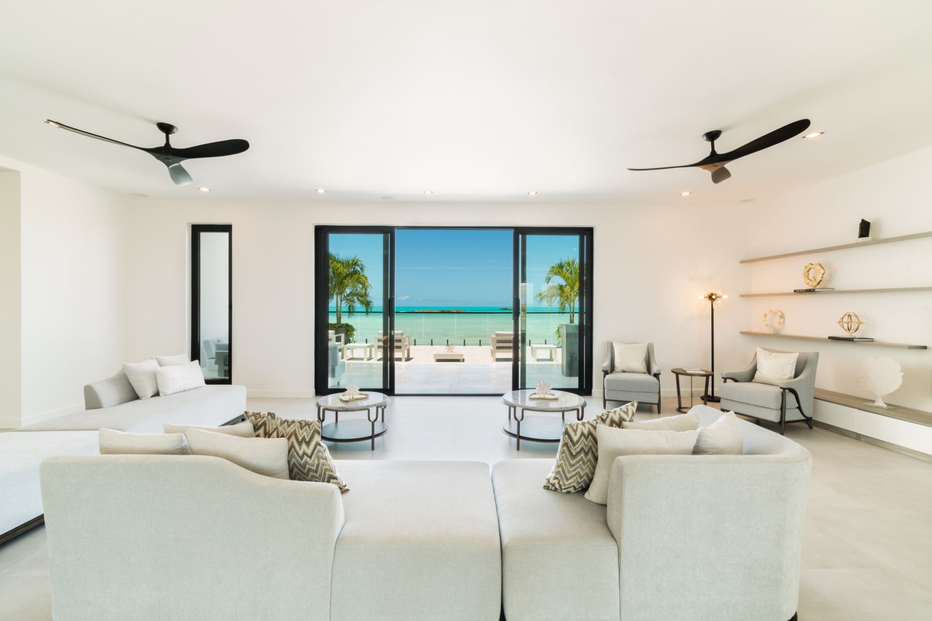 Across the ground and first floors and eight of the nine spacious bedrooms, all with sitting areas and either private balconies or terrace access with ocean views. Most of the rooms have en-suite facilities, though two share a Jack-and-Jill style shower room, ideal for families with children. The master suites also boast dressing rooms and large bathrooms overlooking the turquoise waters of the Caicos Banks.