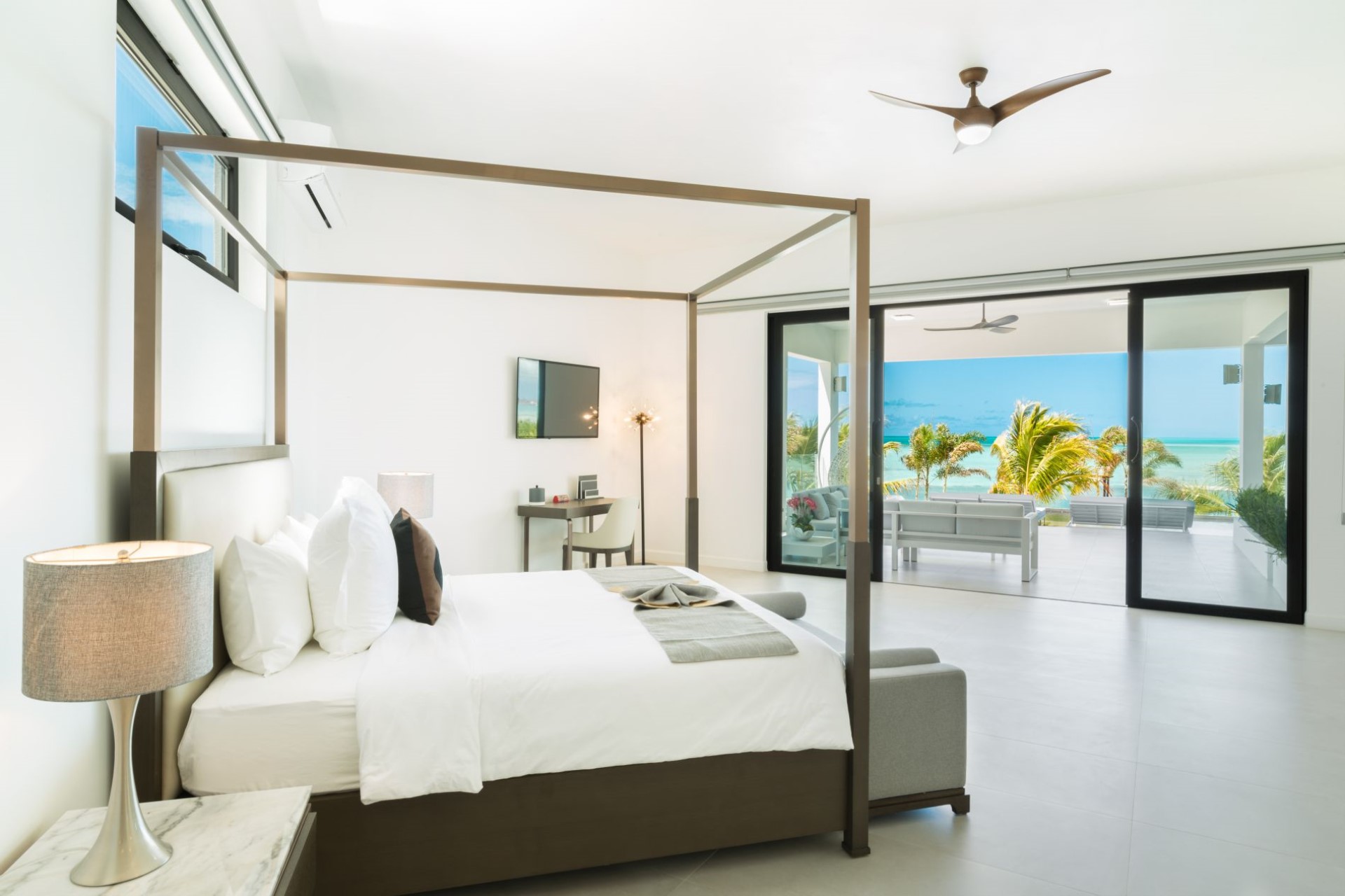 Bedroom 8 (Accessible Master) – king-size bed, desk, sitting area, en-suite bathroom with shower, direct pool terrace access, and ocean views
