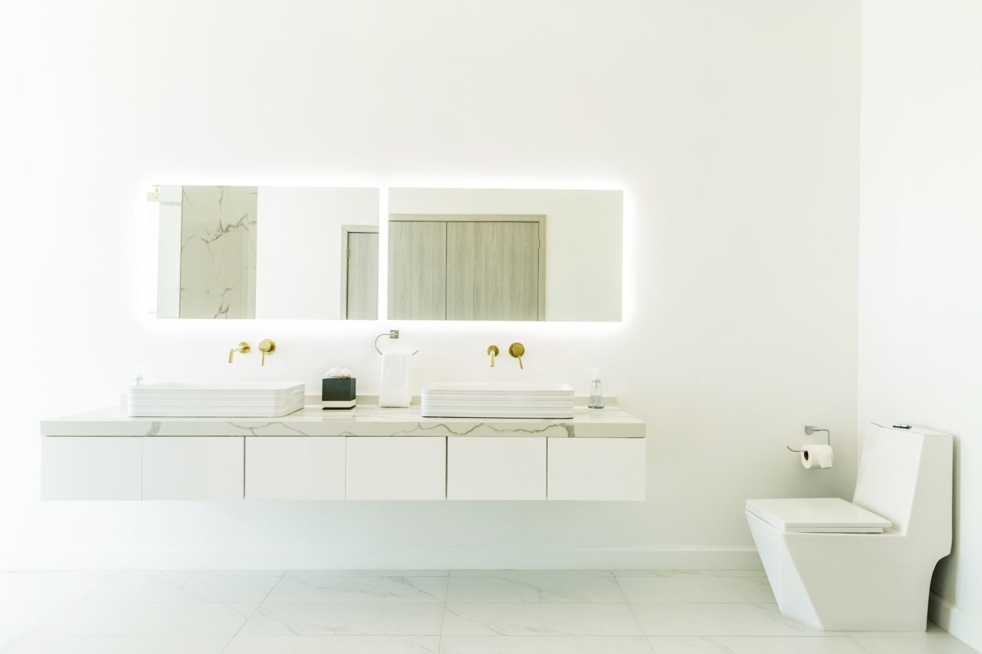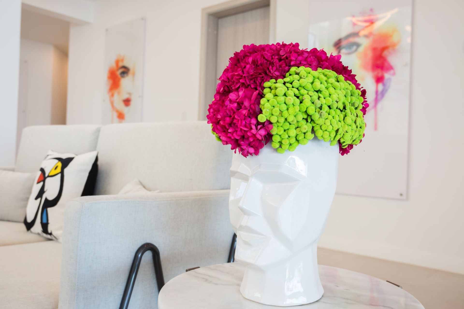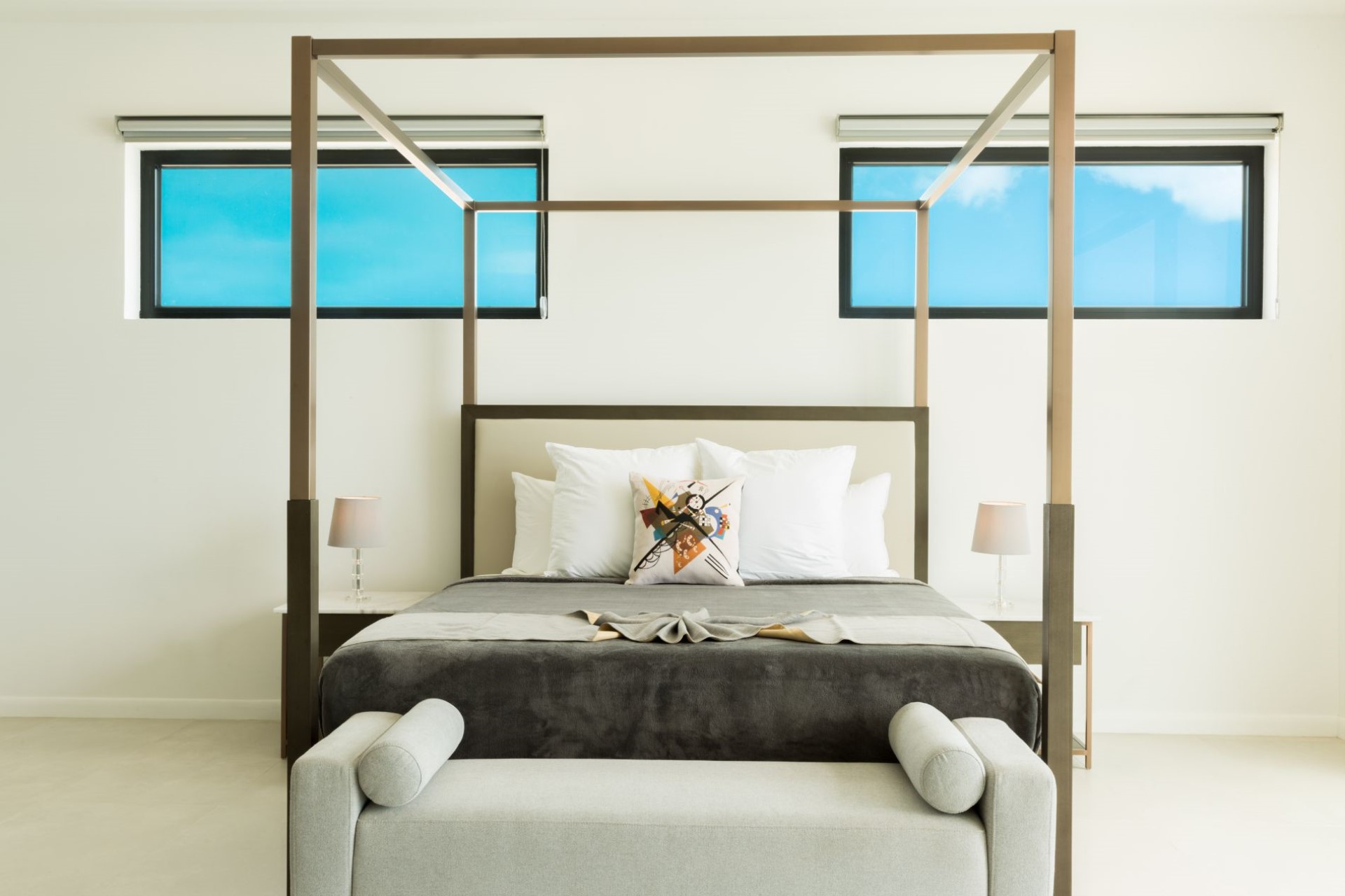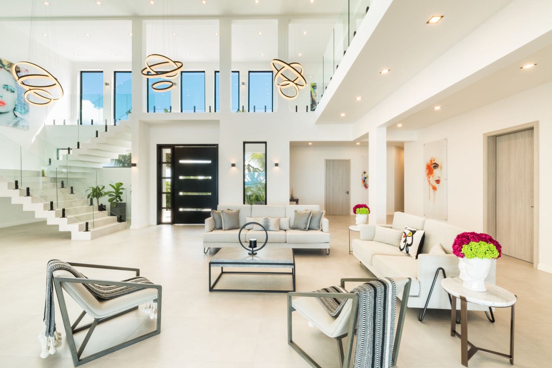 Upon stepping inside, a bright and airy atrium-style living area welcomes guests to their home-from-home. Though decidedly modern, the space is still warm and inviting due to plush furnishings and carefully curated art and design pieces.