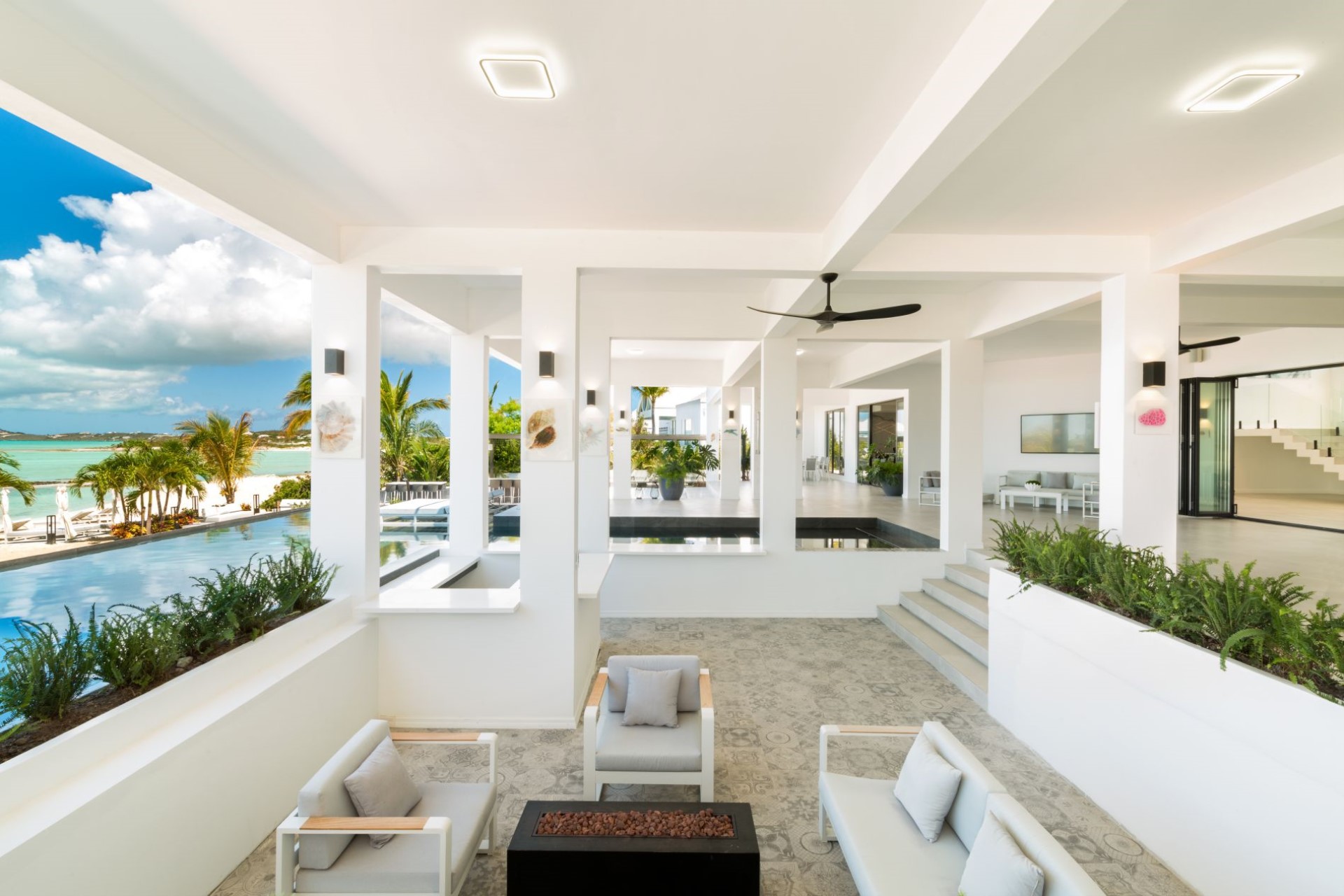 With multiple terraces and balconies offering an abundance of outdoor living spaces, the property is perfect for events and celebrations. Behind the beach is a spacious terrace with a bar, a shaded outdoor dining table and an outdoor kitchen and barbecue area. Beside the pool there is a sunken lounge with a fire pit, perfect for cosy chats on cooler evenings.