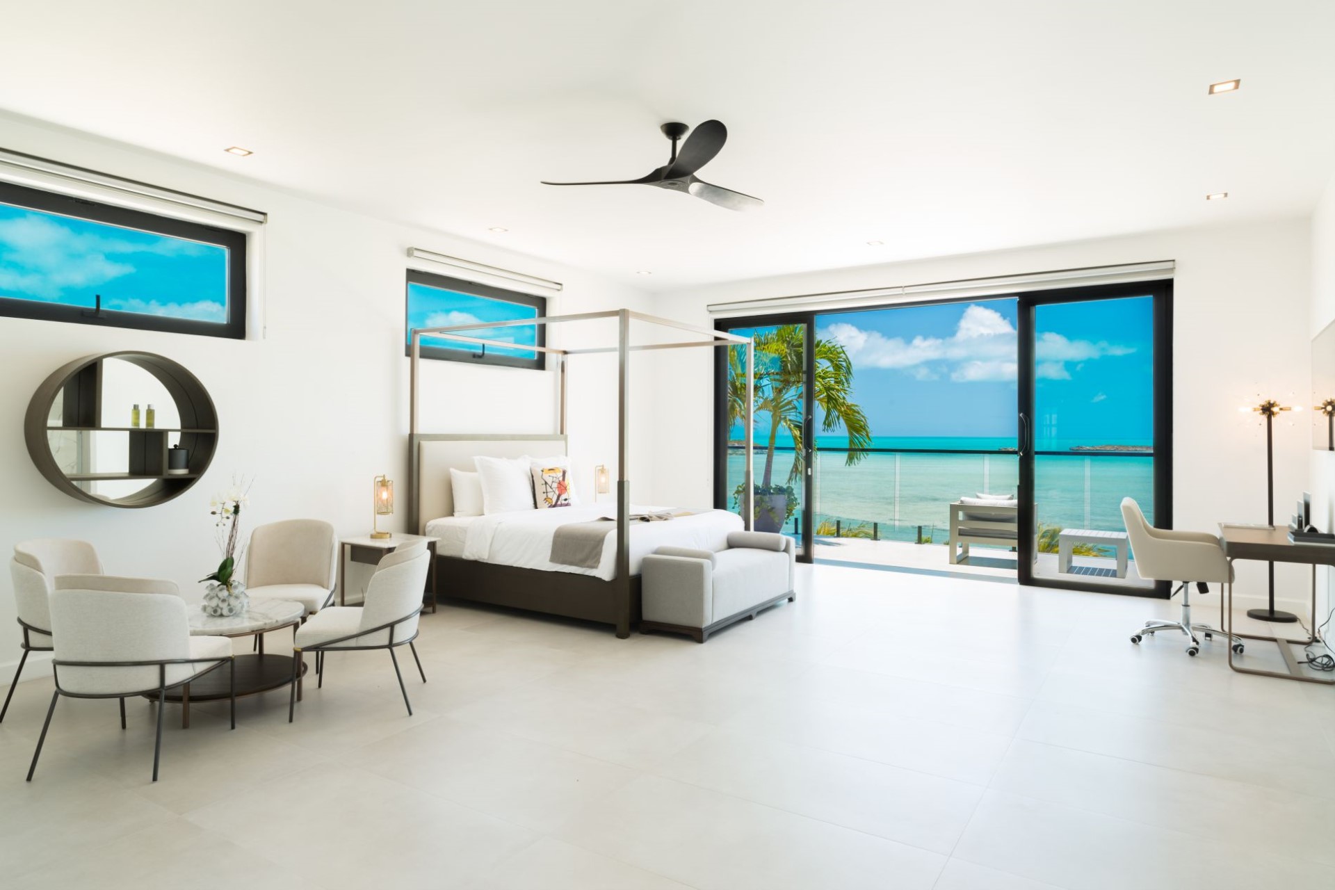 Bedroom 4 (East Side 2) – king-size bed, desk, sitting area, en-suite bathroom with bathtub & separate shower, and private balcony with ocean views