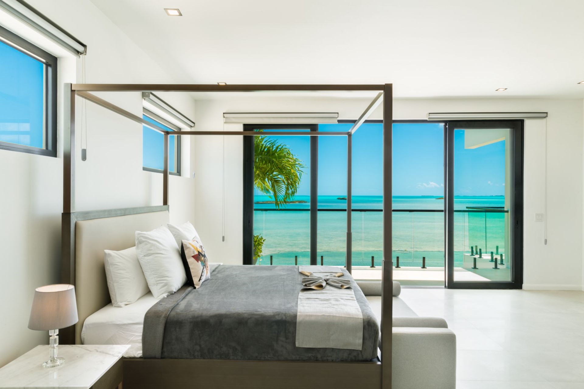 Bedroom 7 (North-West Master) – king-size bed, desk, sitting area, en-suite bathroom with shower, and private balcony with ocean & lake views