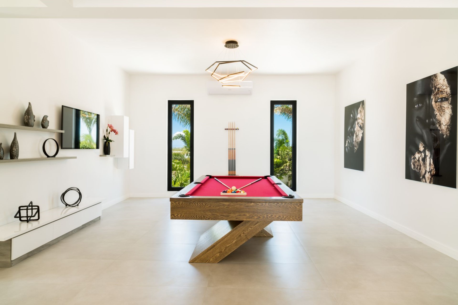 The ground floor is also home the games room with pool table and plenty of board and card games, an office perfect for digital nomads, and an open-plan kitchen and dining area with expansive views through floor-to-ceiling windows.