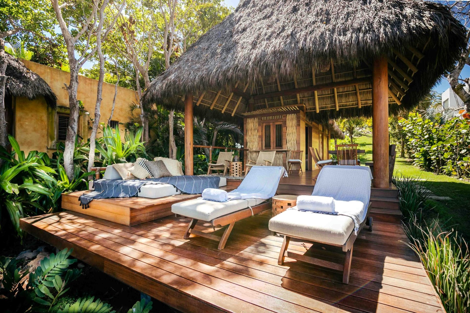 Another of the villa’s highlights is its direct beach access. A short walk through the lush gardens leads guests to a private beach cabana and the warm waters of the Pacific, perfect for surfing, kayaking, and paddle boarding.