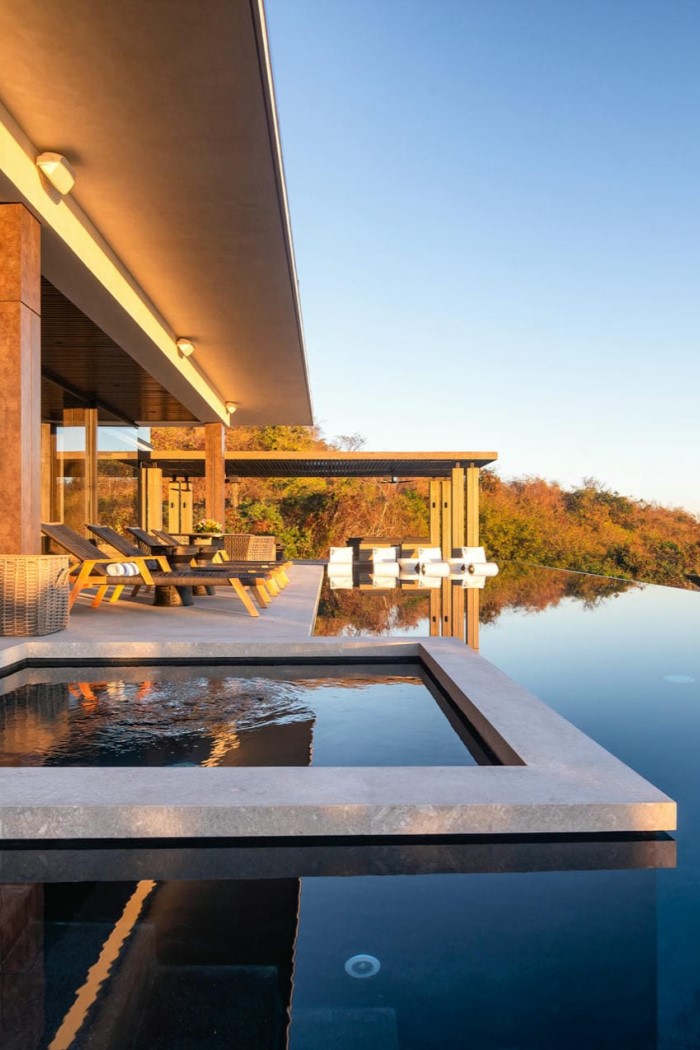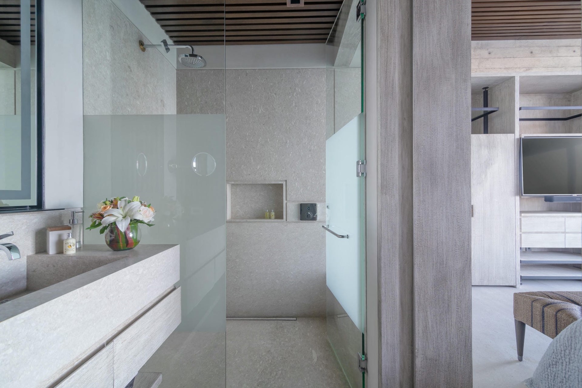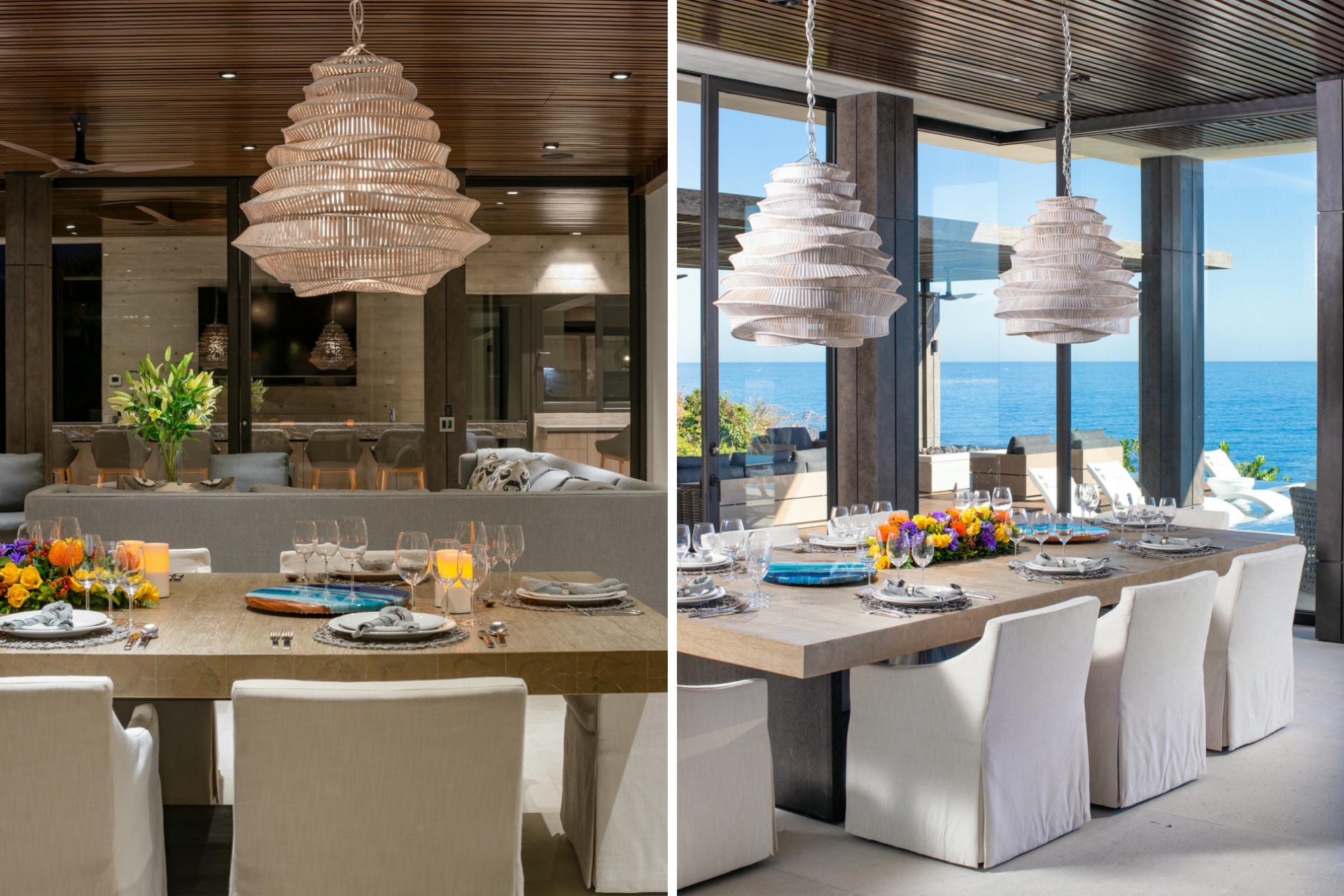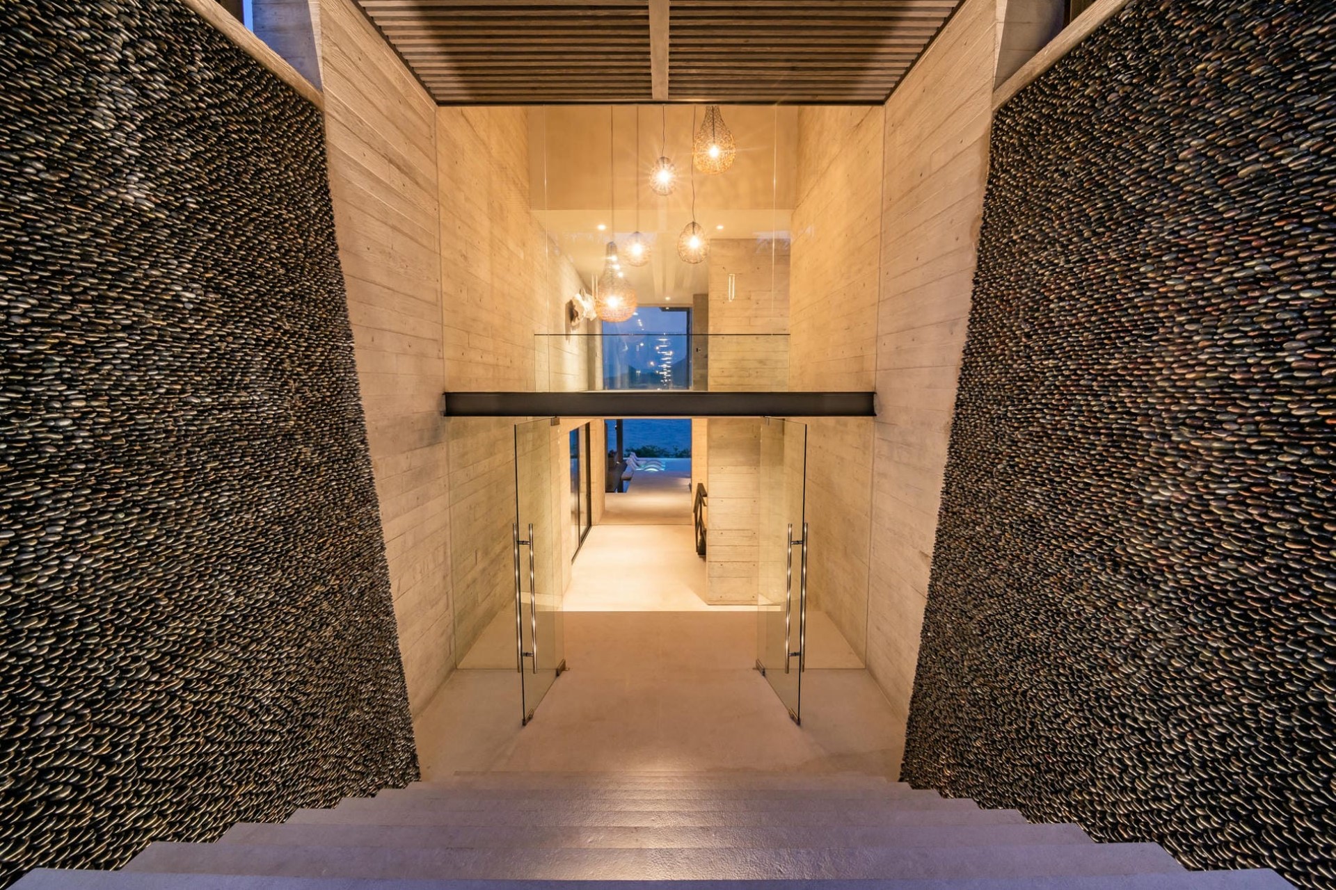 Even entering this villa is a special experience. Guests descend a wide staircase framed on either side by a pebbled water wall that shimmers day or night. With each step, the spectacular views ahead expand, revealing the sparkling waters, lush jungle, and impressive mountains beyond.
