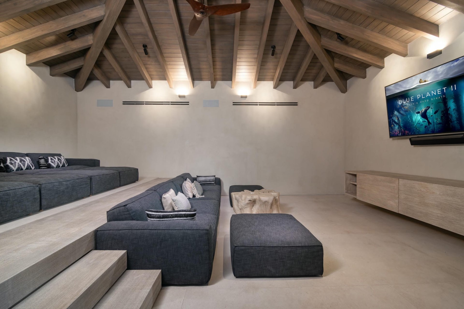 The villa offers a diverse array of facilities to keep guests of all ages entertained. A games room features a large flat-screen TV, computer games, a pool table, and an outdoor area with a table tennis set. Upstairs, a large cinema room with plush seating is ideal for family film nights. Moreover, there is a fully equipped gym for those keeping up their fitness routines during their stay.
