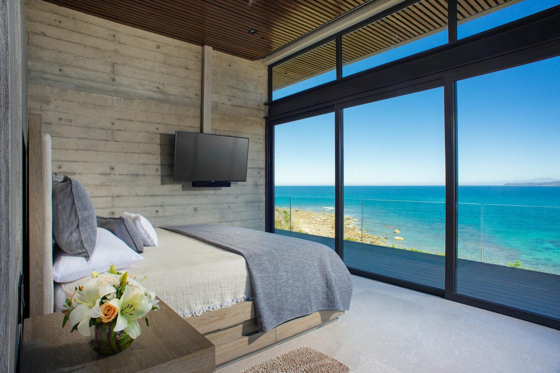 Bedroom 3 – 2 x queen-size bed, en-suite bathroom with shower, terrace access, and ocean views