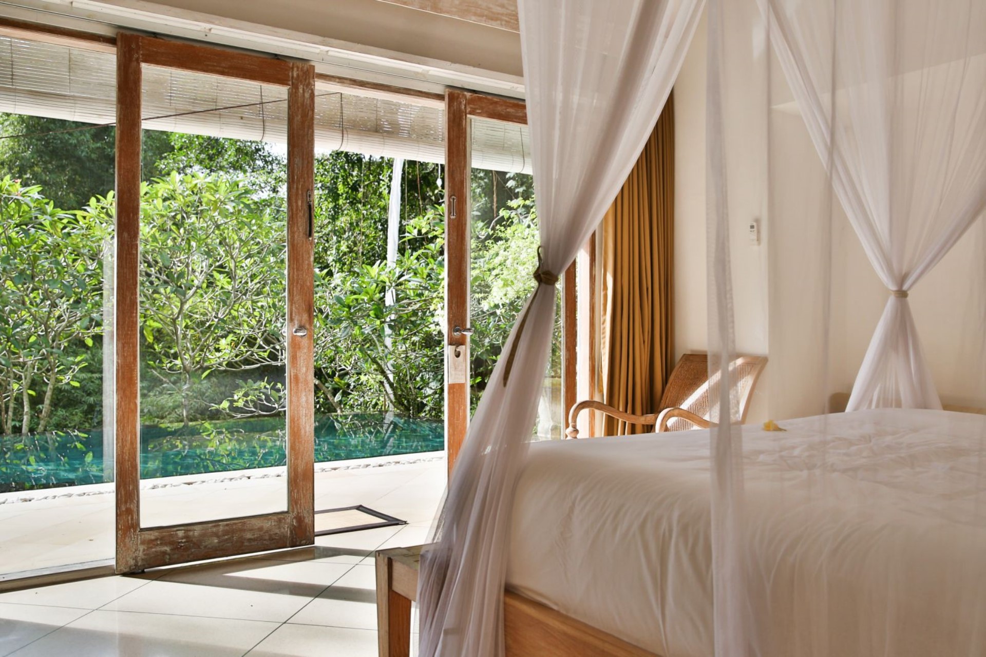 Master Bedroom – king-size bed, dressing room, en-suite bathroom with bathtub & outdoor twin showers, and private balcony with pool, river & jungle views (interconnects with Bedroom 2 and cot may be added on request)