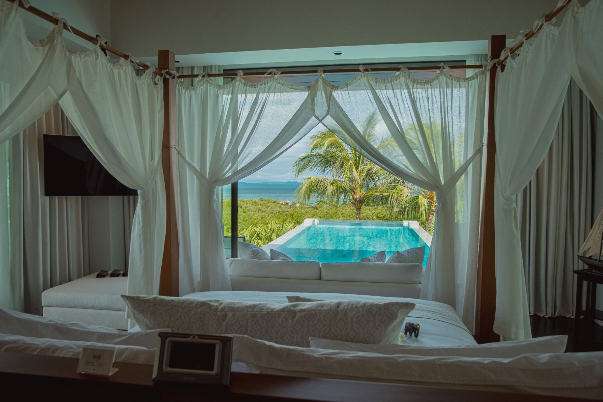 Villa 1 (Master): 1 x King bedroom + 1 x queen bedroom (suitable for children), bathroom with bathtub & separate rain shower, full minibar, private balcony, private pool, and ocean views