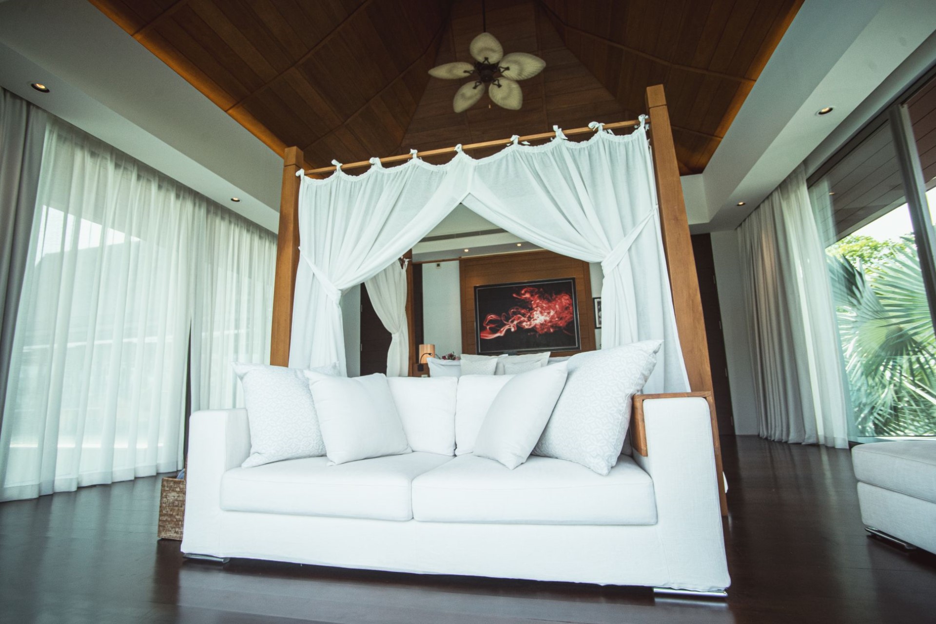 Villa 2: 1 x King bedroom, living room with queen-size sofa bed, en-suite bathroom with bathtub & shower, full minibar, outdoor shower, private garden, and pool access