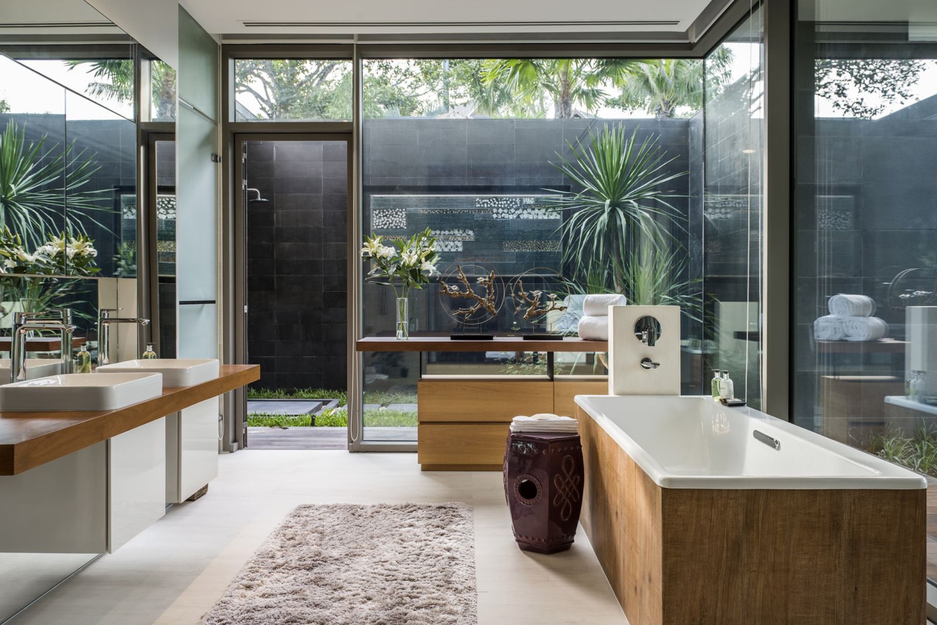 Featuring glass-fronted pavilions housing the bedrooms and en-suite bathrooms, the natural light pours through the windows in abundance, giving clear views of the surrounding pools.