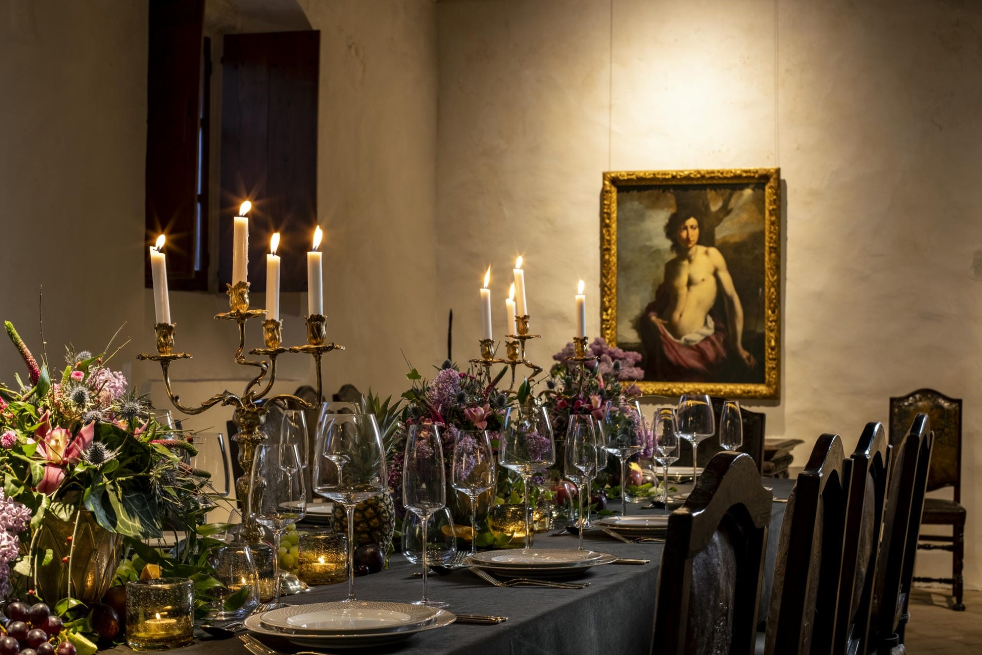 The entrance – the Angel’s Hall – features two 18th-century baroque angels along with original wall inscriptions. The space can be used for welcome drinks or larger sit-down dinners. More intimate family meals can be held in the Old Kitchen, which has a fully functional bread oven and an open fireplace, and leads out to a peaceful little garden.