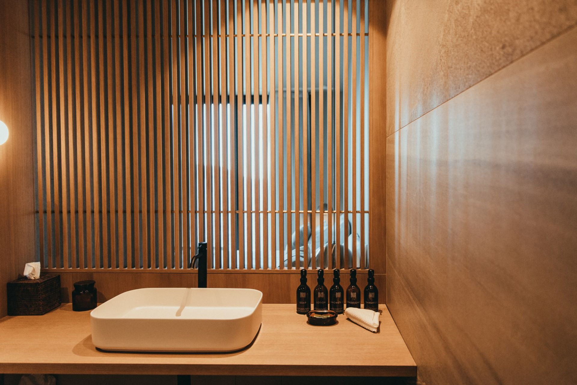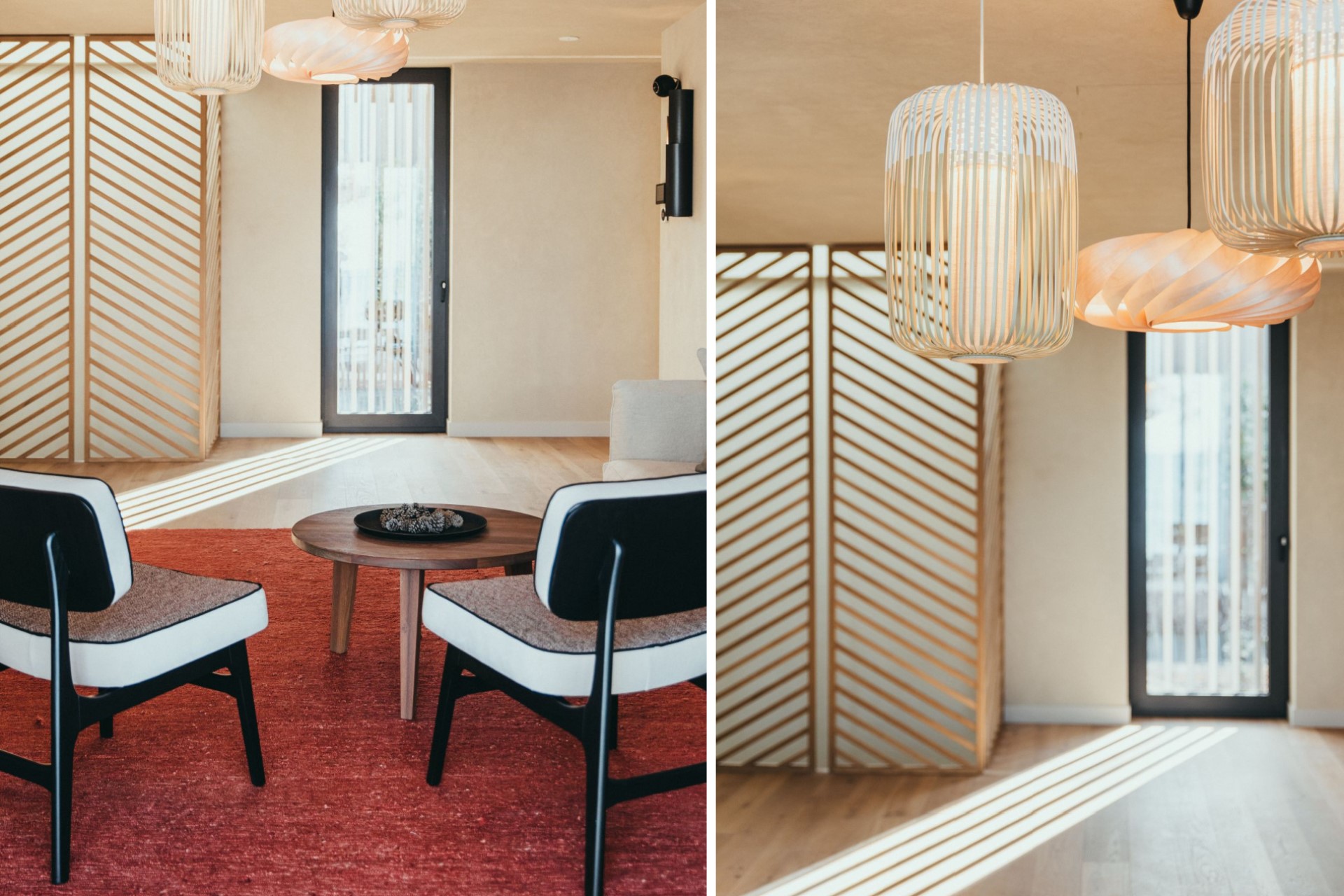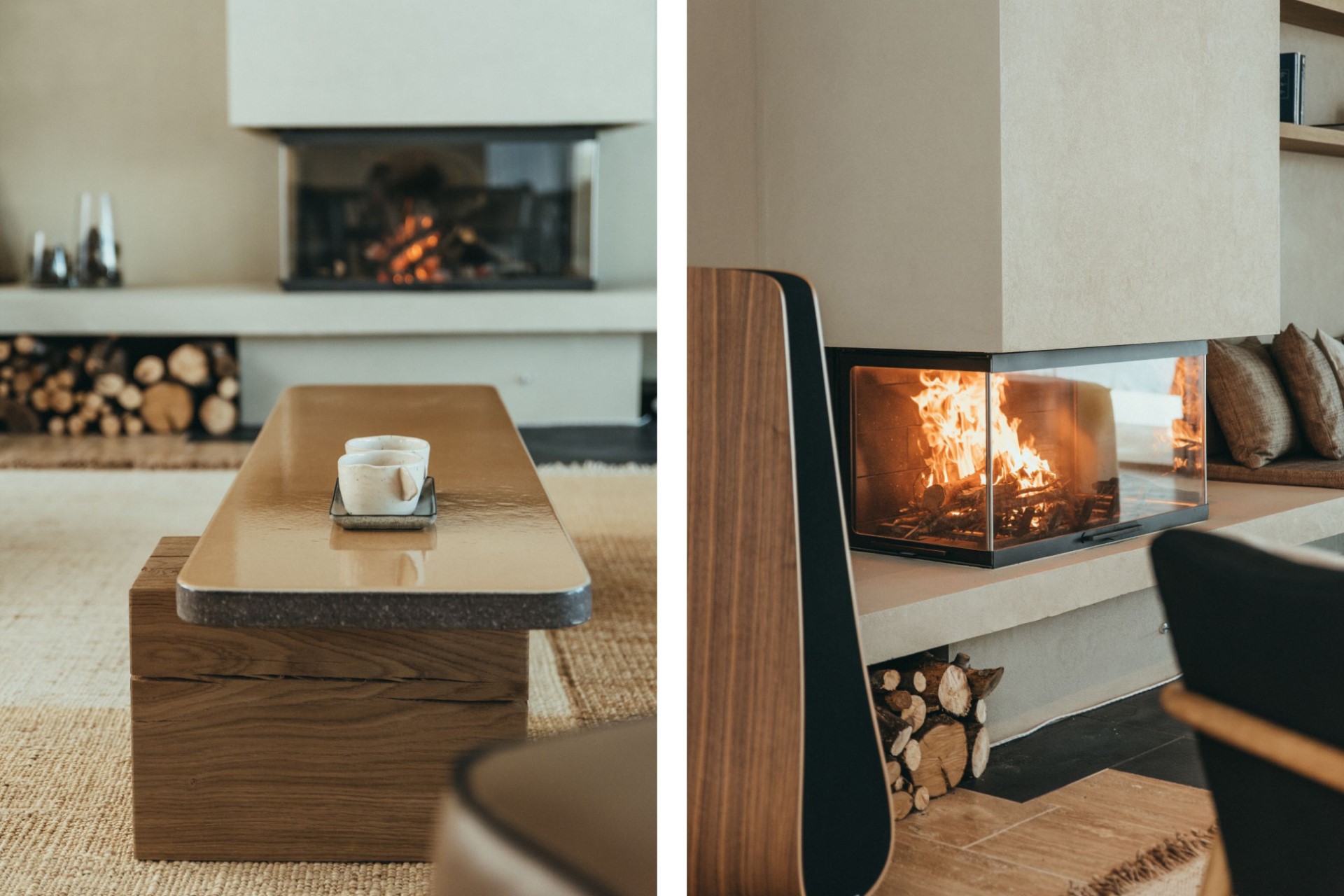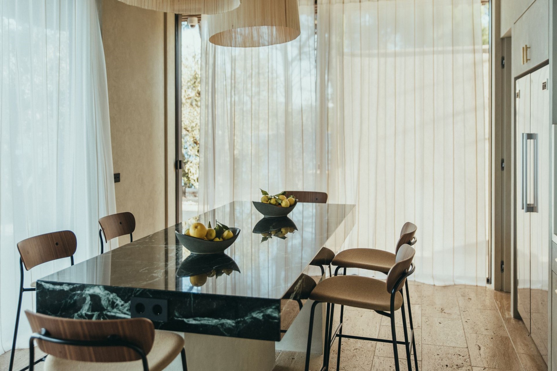 The minimalistic interiors draw influences from Japanese and French design for a unique, modern feel. The open-plan living area comprises a lounge area with fireplace for cosy nights in and a wooden dining table for elegant meals. Glass doors on either side open to the villa’s private grounds, allowing cool breezes to flow through the space.