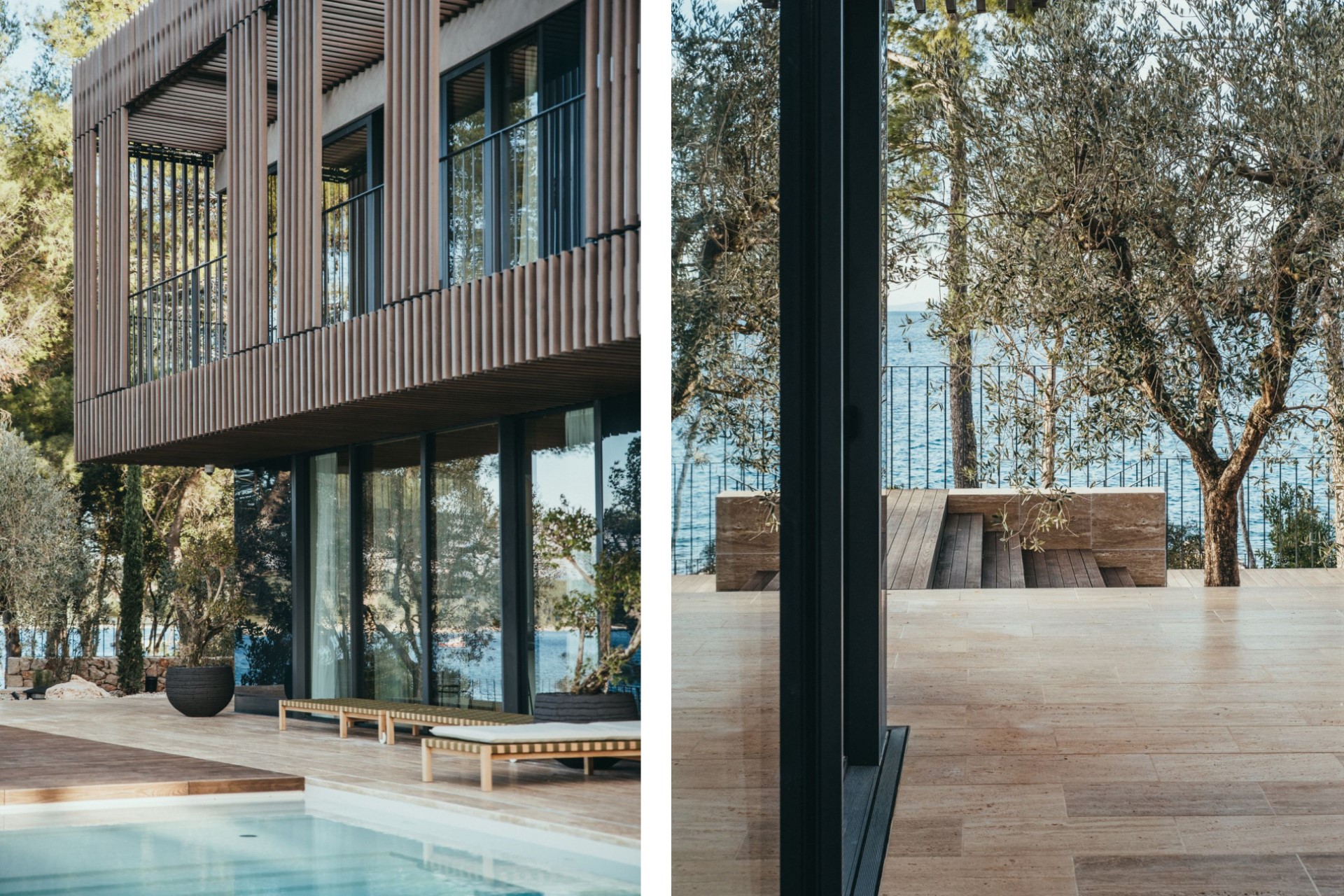 Lush Mediterranean vegetation surrounds the villa, providing privacy and plenty of shade. A vast terrace stretches across the property, offering space to relax and appreciate the stunning views. Sun loungers line a 55-metre heated infinity pool, and a cosy outdoor seating area surrounds a bubbling Jacuzzi. There is also an al fresco dining area with direct access to the villa kitchen and an outdoor shower room for guests’ convenience.