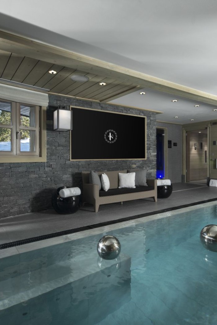 The chalet itself covers 635 square metres set over four floors. The ground level of the property is designed for relaxation and entertainment. Here, guests can be pampered by the wellness facilities, including a swimming pool with jets and waterfalls, a hammam, sauna, and poolside relaxation area.