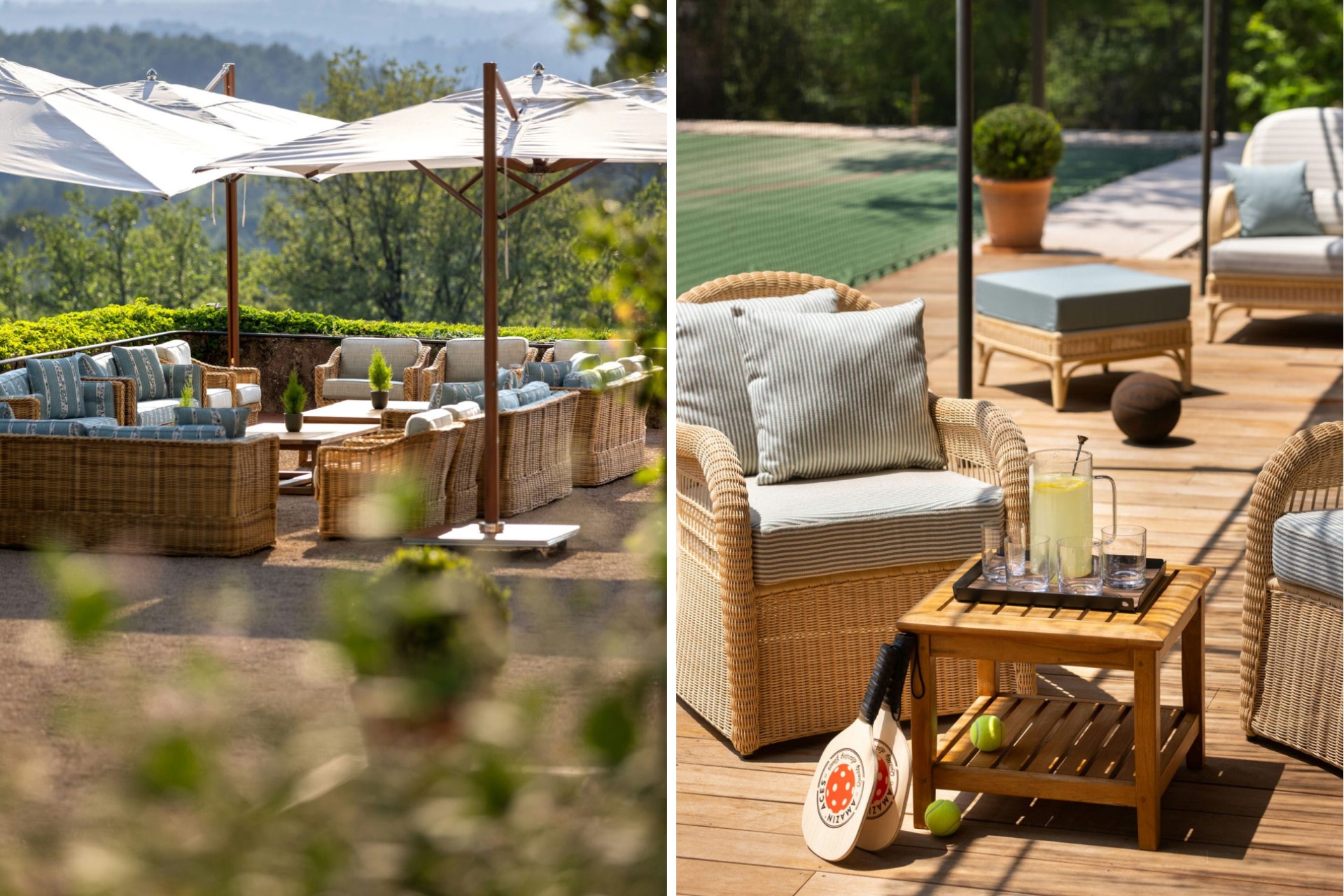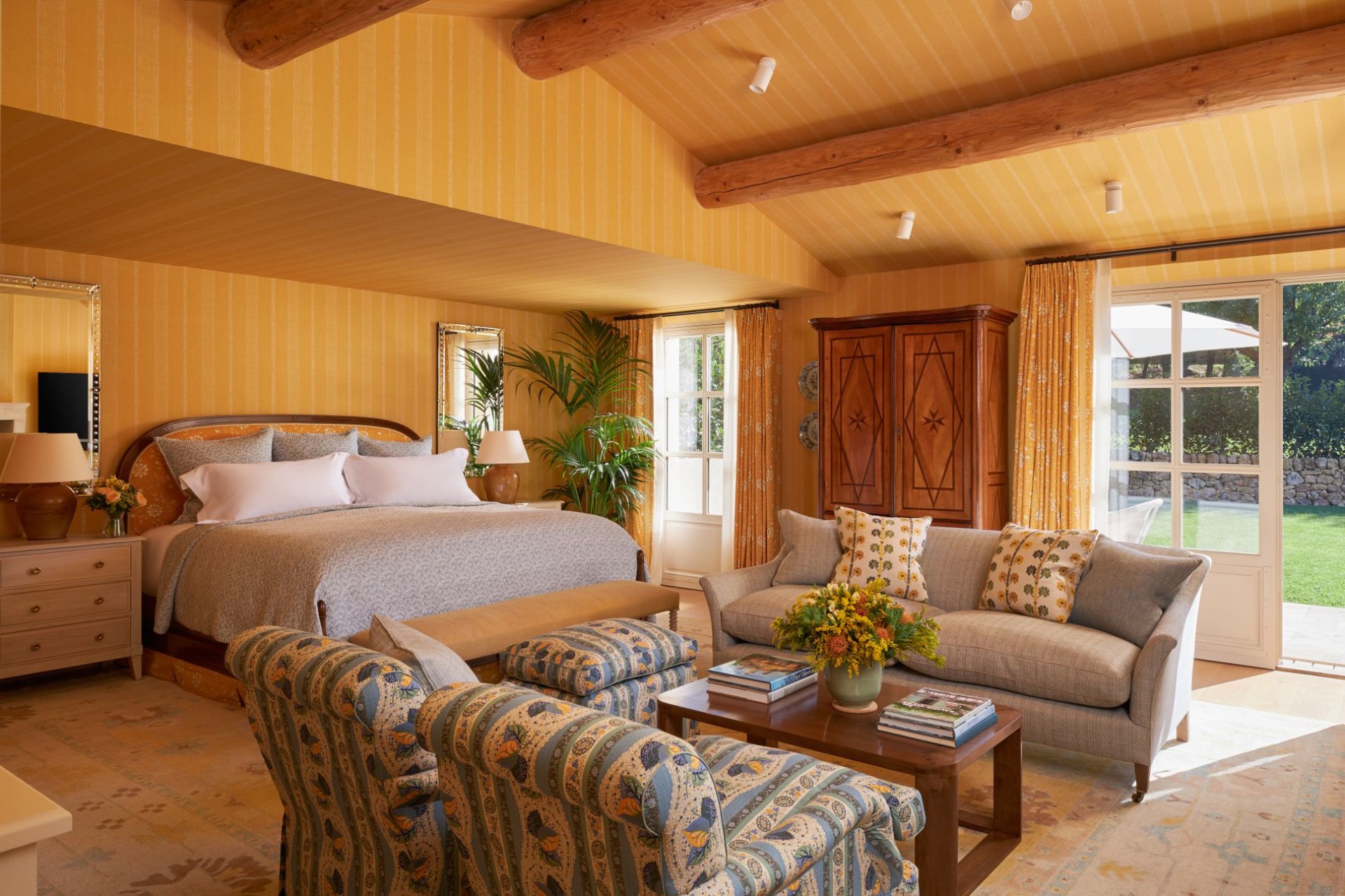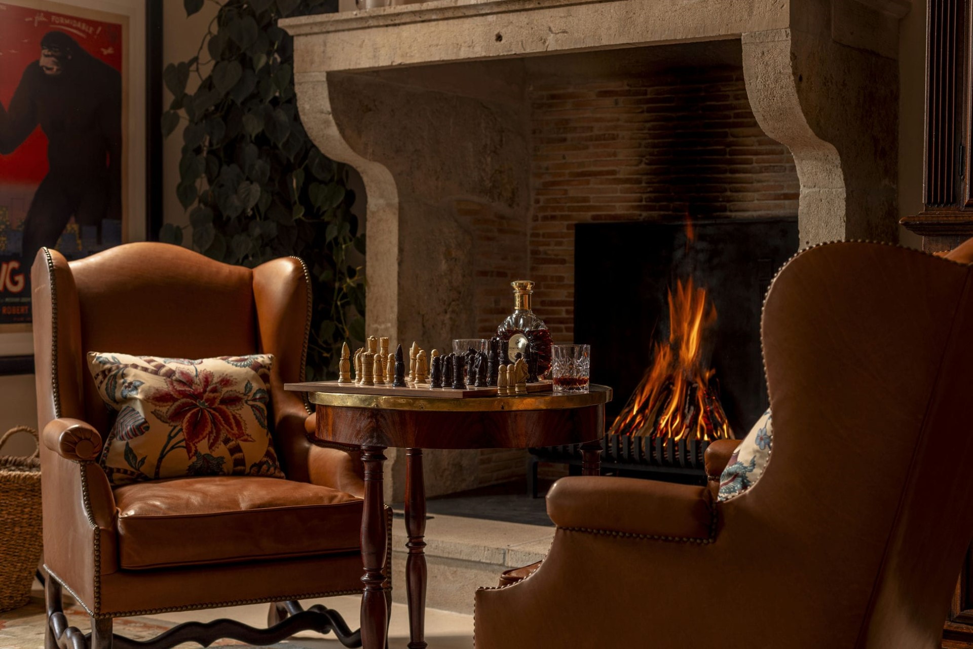 The nine guest bedrooms are set across the bastide’s two floors. Each en-suite bedroom features a sitting area with a wood-burning fireplace, top entertainment facilities, original artwork, and stunning views of the surrounding forests and vineyards.