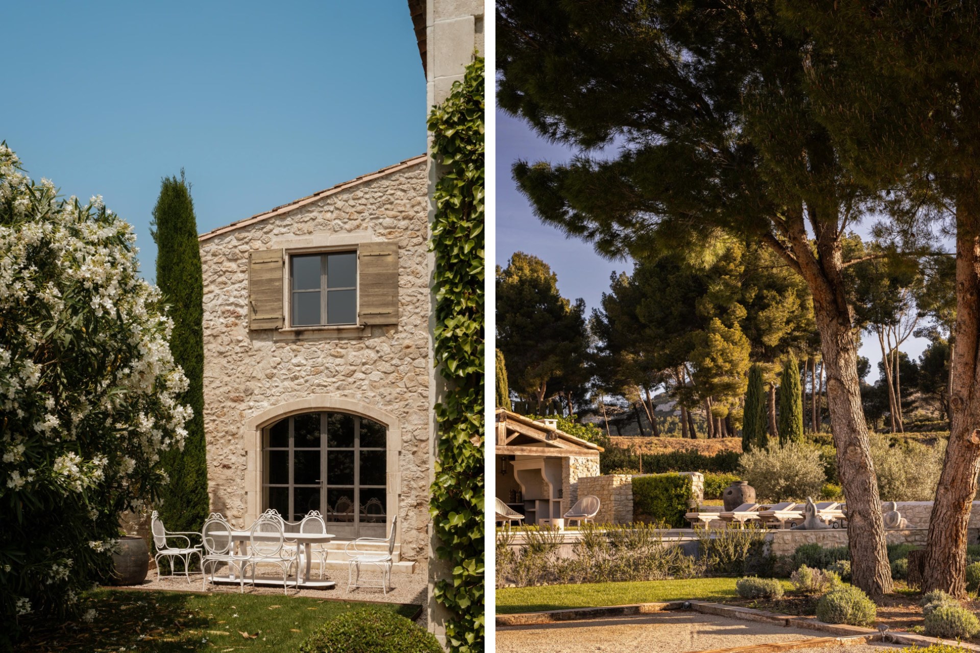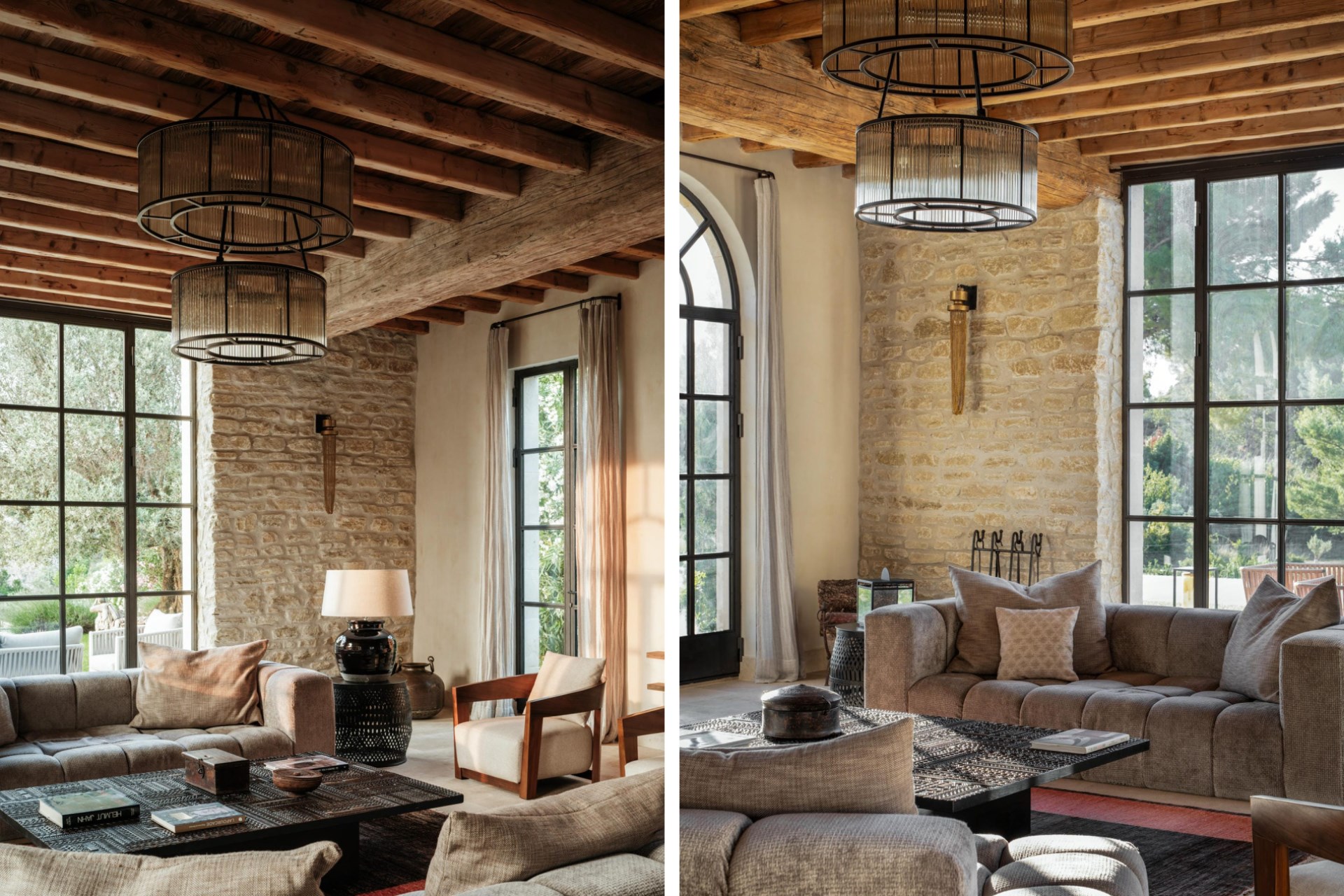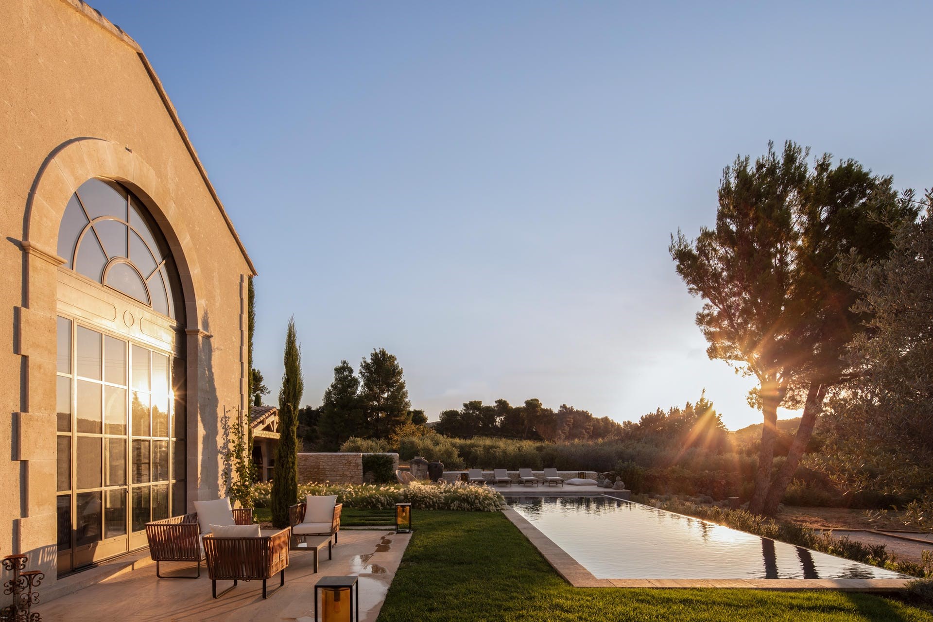 Indoors, the 18th-century bastide has been expertly restored. Floors laid with polished local limestone or dark oak, exposed ceiling beams hung with pendant lighting, and cosy fireplaces create a modern farmhouse feel.